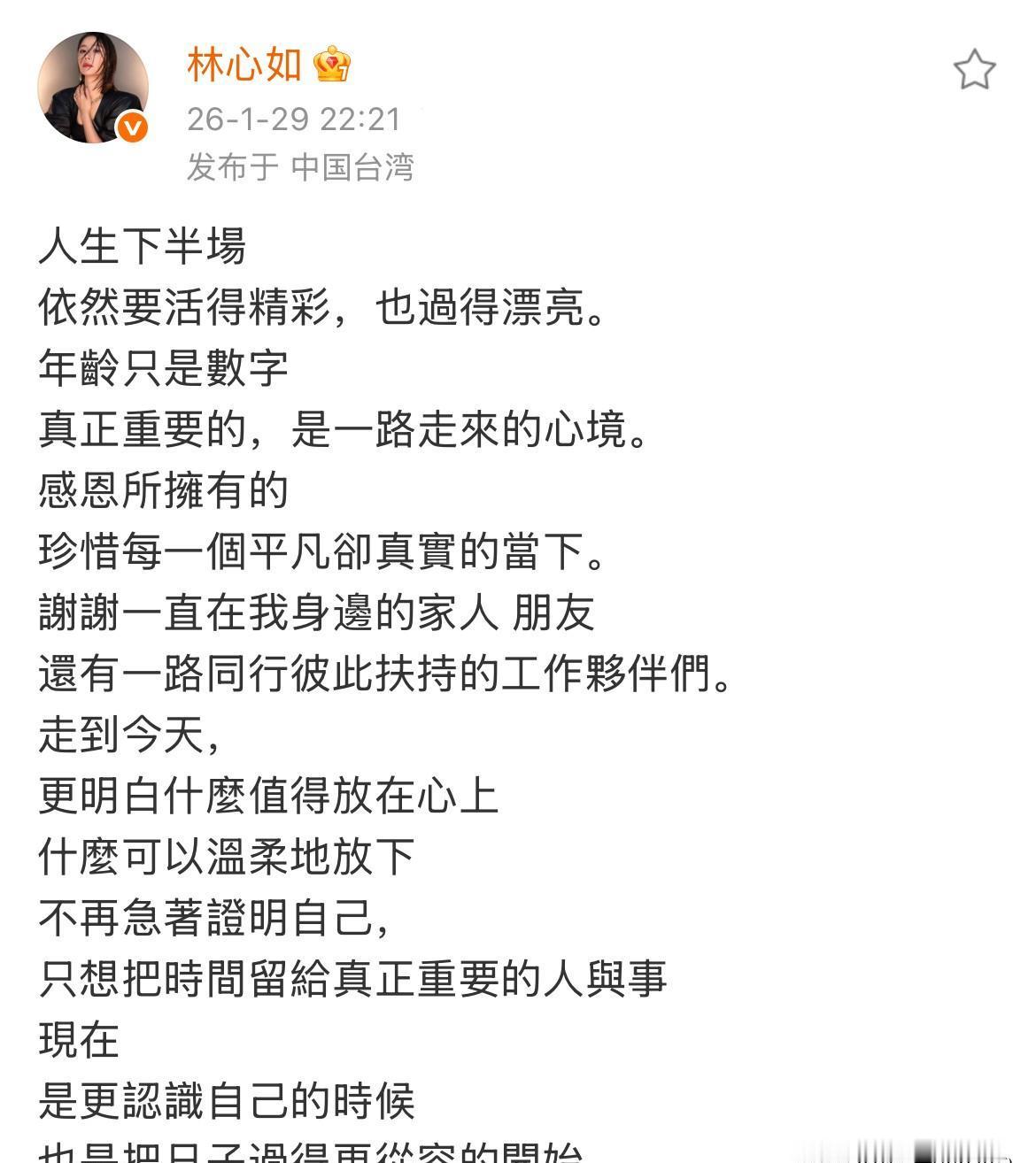 林心如快50岁的消息,像一枚炸弹,在闺蜜群里炸开。 她根本没把年龄这回事放在眼里。 转身就撕掉“甜心”标签,砸出一部《华灯初上》,把人性的幽暗与光亮,玩得明明白白。 再看她和霍建华,十年挚友变枕边人。 别人眼里是中年夫妻的平淡,他们对视的眼神里,却依然有火花在燃烧。 这才明白,女人真正的“防腐剂”,从来不是医美和玻尿酸,而是手里有牌,心里有爱,眼里有光。 所以你看,女人的巅峰,从来不是那个娇艳欲滴的18岁,而是她终于看懂世界,并决定自己书写规则的那一刻。