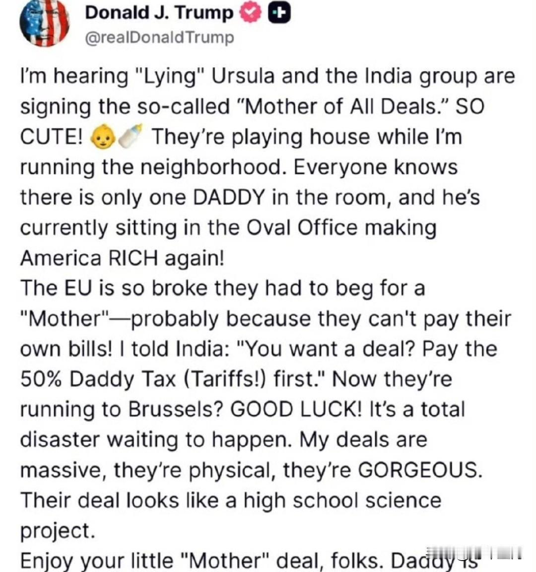 唐纳德·J·特朗普 我听说“撒谎的”乌苏拉和印度正在签署所谓的“史上最大的交易”。 太可爱了!他们在玩过家庭模拟游戏,而我则在管理整个社区。 大家都知道房间里只有一个爸爸,他现在正坐在椭圆形办公室里,让美国再次富裕起来! 欧盟穷得叮当响,不得不向“母亲”求助——可能是因为他们付不起自己的账单! 我告诉印度:“你们想要协议?先支付50%的爸爸税(关税!)。” 现在他们跑到布鲁塞尔去了?祝他们好运! 这完全是一场即将发生的灾难。我的协议规模庞大,内容具体切非常出色。他们的协议看起来像一个高中科学实验项目。 伙计们,好好享受你们的小“妈妈”协议吧。爸爸正忙着赢呢! 果然,特朗普对于任何绕开他的经贸协议都极为不满,这是一种病。