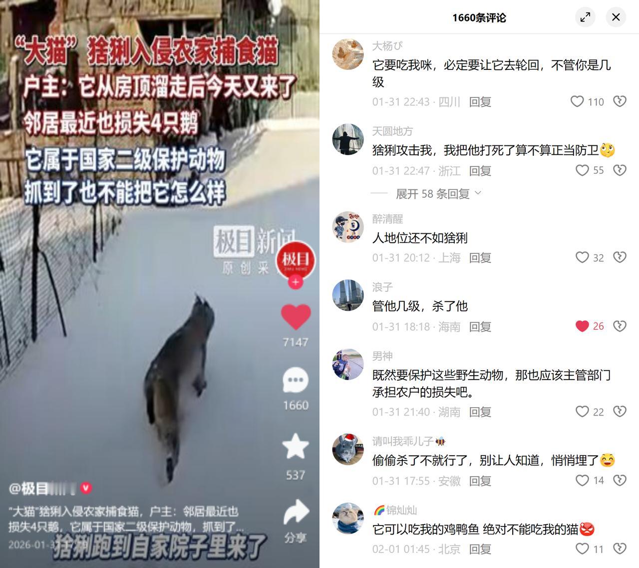 猞猁连闯农家,农户有苦难言。 呼伦贝尔一农户家猫被猞猁捕食,邻居也损失4只鹅,更闹心的是这大猫刚走又来。可因为是国家二级保护动物,打不得防不住,想找补偿还碰了壁,当地现行补偿办法只覆盖舍饲圈养的牲畜家禽,家猫算宠物,鹅也没明确在补偿清单里,损失只能自己扛。 这事看着荒唐,实则暴露了野生动物保护的一个盲区:只强调对动物的保护义务,却没补上对普通人财产权益的兜底。动物确实该护,可总不能让老百姓用私人损失为公共保护买单吧? 大家满是愤懑,本质是怕成了规则夹心层:守规则要吃亏,破规则要担责,求助没门路。什么时候保护的标尺,能同时照到人的难处?