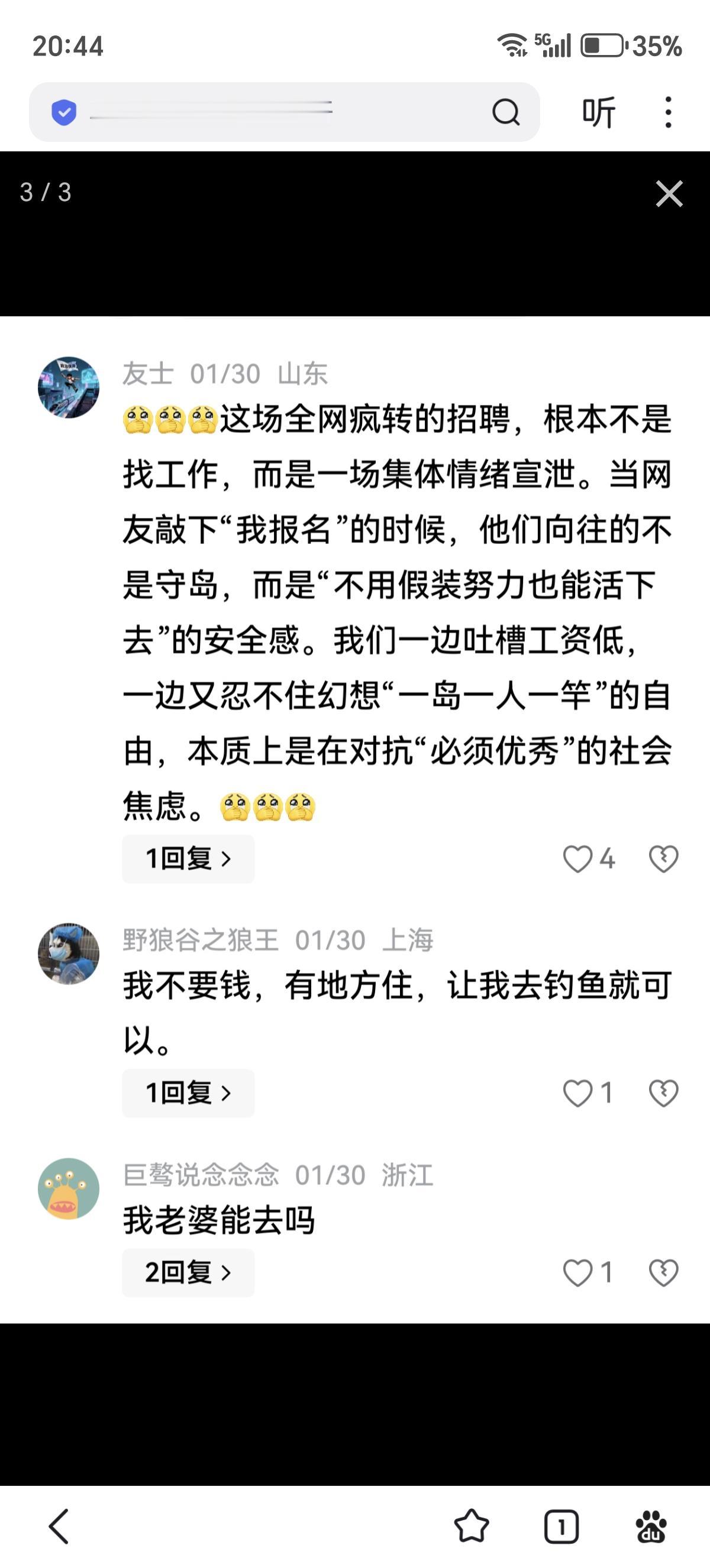 对有些张口就说找不到工作的人来说,这不失为一个好机会。岛上生活自由松驰,每天可以睡到自然醒,没有加班,没有无效社交,打游戏也不会有人管,还不耽误上网。机不可失,好好把握!