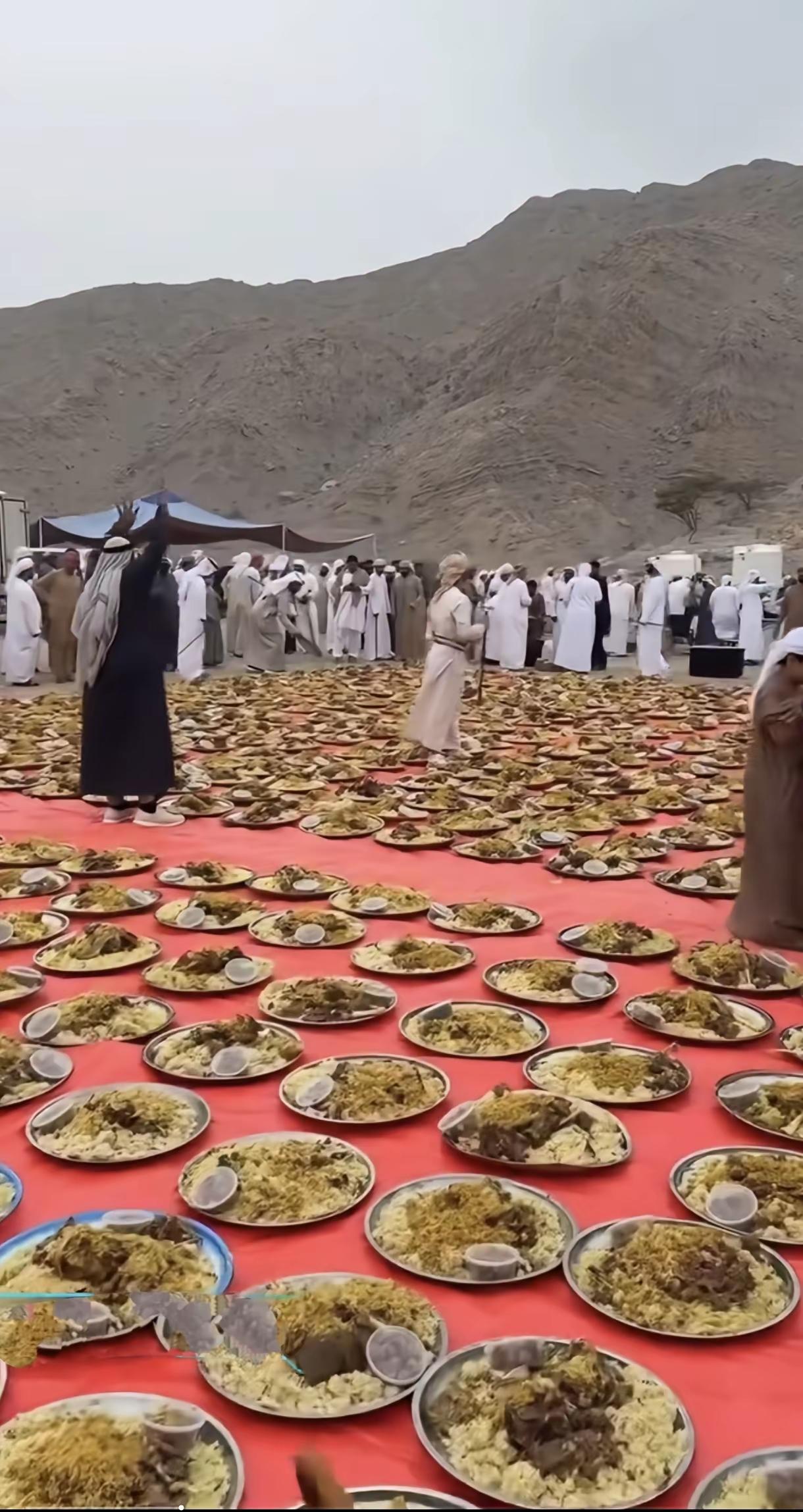 中东土豪的公开宴席再次颠覆了国人认知的长桌宴 谁说中东人吃饭不爱用盘子?真正的中东人吃饭是没有碗,全程都是盘子。而东方大国的很多宴席盘子和碗都是交替使用的。 中东土豪从来不亲自饲养牛和羊,饭桌上却顿顿离不开牛羊肉,主要是他们地下有取之不尽用之不竭的石油可以换钱,奢华的生活来源于金钱。上帝造就整个中东是不毛之地,常年的高温和干旱被世人沦为非宜居之地,结果地下丰富的石油却成就了他们富足的生活。