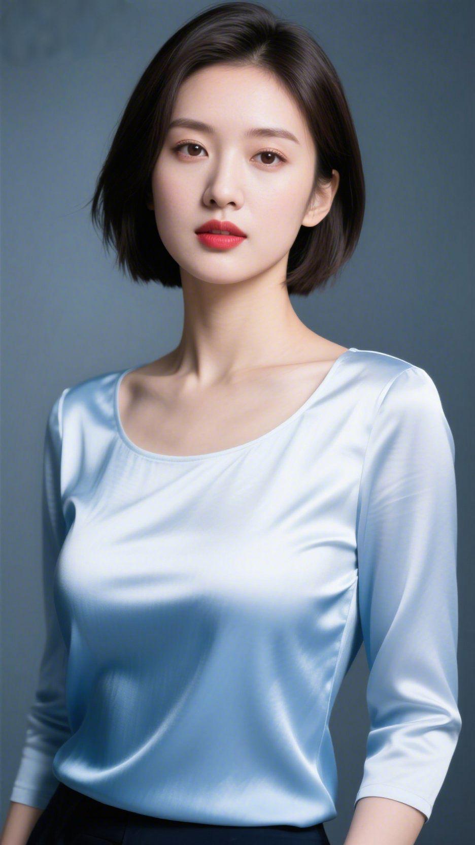 《浅蓝衫栖了柔光》 灰调背景里,这抹浅蓝像盛了半盏清光——缎料裹着轻软的质感,顺着衣身漫开淡润的光泽,连短发垂落的弧度,都浸着舒展的温静。 没有繁杂装饰,只这抹蓝妥帖地衬着气息,像把晴日里的云色裁作衣衫。唇间的红是轻缀的暖意,和衣料的柔融在一起,连周遭的光影都放缓了节奏。 好看从不是喧哗,是这抹恰好的蓝,是目光落处,像触到云的温软。 浅蓝衫衣轻韵 温静气质穿搭
