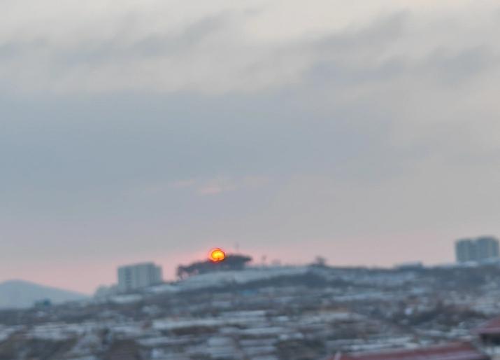 山尽管是秃的,但是因为它小。但是山顶上还有一簇松树,在雪地里是一种靓丽的雪景。一出就躲在树的后面。喷薄欲出,给一种欣欣向上的力量。