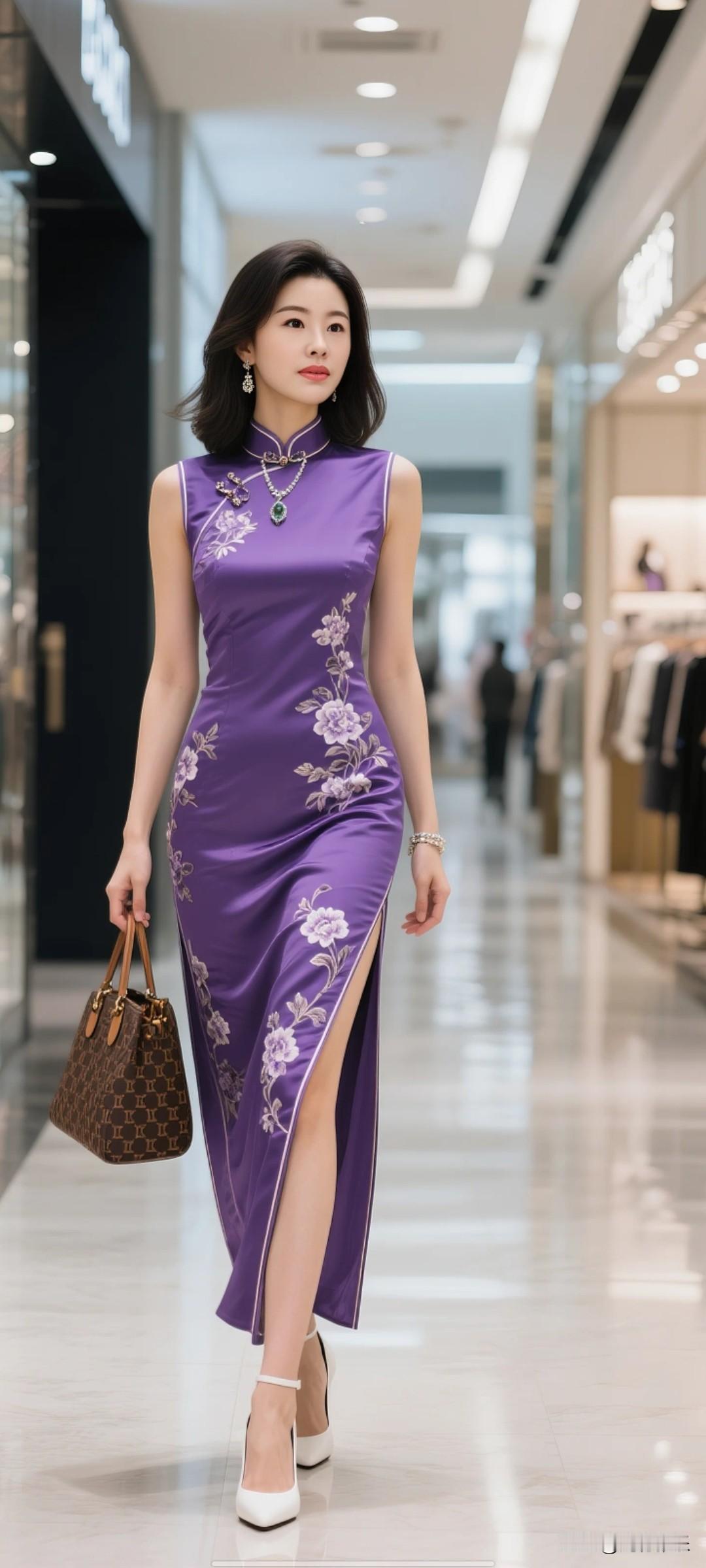 中式紫款长旗袍。气质绝对不一样。太优雅了。