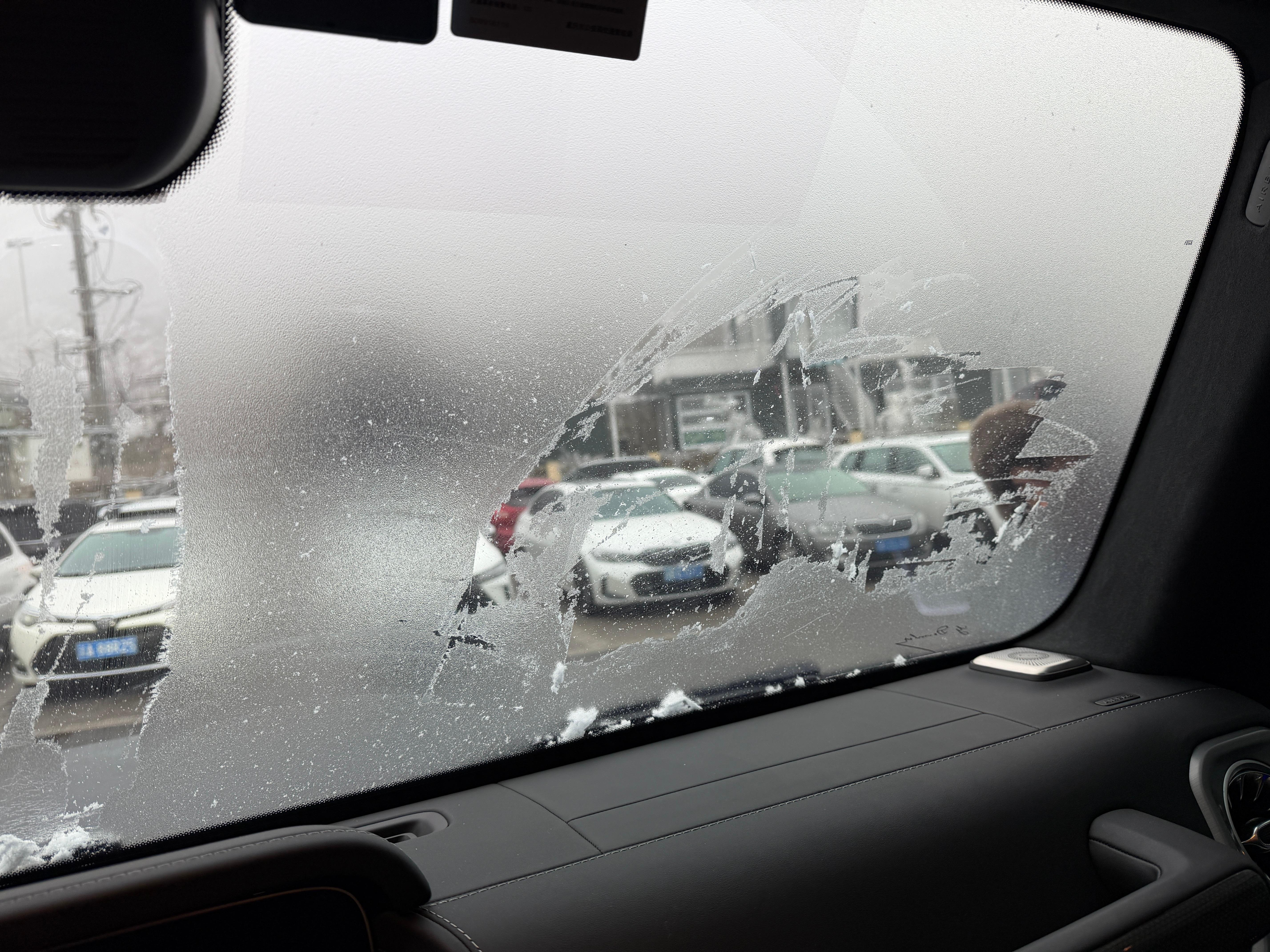 一晚上挡风玻璃全冻住了。得人工去冰