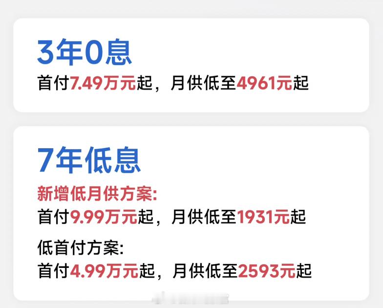 —— 七年低息,新增低月供方案可选,首付 9.99 万元起,月供最低不到 2000 元。