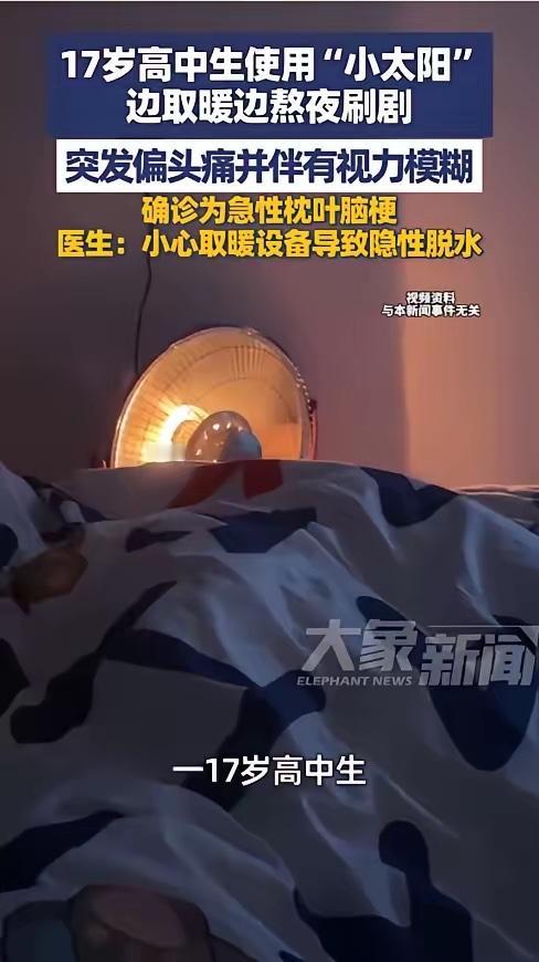 “悲剧还是发生了!”1月29日,福建,一17岁高中生为了暖和点熬夜刷剧,把小太阳放在身边烤了好几个小时,结果突然开始头痛欲裂,看东西一片模糊,家人赶紧送医,最终诊断为急性枕叶脑梗。网友:烤小太阳怎么就能引发急性脑梗呢? 深夜的房间里只开着手机屏幕的光,17岁的少年裹着薄外套,把小太阳调到最高档位,紧紧放在腿边,福建1月底的阴雨天气带着湿冷,他想靠着取暖器熬过寒夜,追完更新的剧集。这一烤就是整整四个多小时,期间他保持着低头看手机的姿势,没有起身活动,也没有喝一口水,完全没意识到身体正在被持续的高温悄悄影响。剧烈头痛袭来的时候,他手里的手机直接砸在床面上,眼前的画面从模糊变成重影,连喊家人的声音都带着颤抖,家人冲进房间时,他已经扶着额头坐不稳,脸色发白,完全失去了平日的精气神。 很多网友看到诊断结果都觉得不可思议,普遍认为脑梗是老年人群的专属病症,和十几岁的青少年毫无关联,更无法把取暖器和脑血管急症联系在一起。接诊的医生在后续的病情说明里给出了明确解释,持续近距离使用小太阳,会让身体局部皮肤温度快速升高,体表血管在高温刺激下持续扩张,体内的血液会大量向体表表层汇集,大脑供血量随之出现短暂不足。少年连续熬夜本就让身体处于疲劳应激状态,脑血管的调节功能已经下降,再加上久坐不动导致血液循环速度放缓,长时间不补水让血液黏稠度上升,多重因素叠加在一起,直接诱发了急性枕叶脑梗。 枕叶是大脑负责处理视觉信号的核心区域,这也是患者发病后出现视力模糊、视物不清的直接原因。2026年全国冬季心脑血管疾病防控中心发布的监测数据显示,近三年来,冬季急性脑梗的发病群体正在不断年轻化,15到25岁的青少年患者占比逐年上升,不当取暖、长期熬夜、久坐少动、饮水不足,是导致年轻群体突发脑血管疾病的四大主要诱因。 福建当地的儿科与神经内科联合医师也发出过提醒,小太阳这类红外辐射取暖设备,不适合近距离长时间使用,局部持续高温会打破身体的血液循环平衡,对于代谢能力尚未完全稳定的青少年来说,这种刺激带来的风险,远比成年人更高。不少家庭都存在冬季取暖的认知误区,觉得只要不触电、不起火,取暖设备就没有安全隐患,却忽略了高温对人体血液循环、内分泌带来的隐性伤害。 这个17岁高中生的遭遇,给所有家庭都敲响了警钟。年轻人总觉得自己身体底子好,能扛得住熬夜,能忽视不良习惯带来的影响,可身体的损伤从来都不会提前预警,一次侥幸的熬夜,一次不当的取暖,都可能成为诱发急症的导火索。急性脑梗的救治有严格的黄金时间,若是送医稍有延误,很可能留下永久性的视力损伤,甚至更严重的后遗症,代价根本不是一个未成年孩子能承受的。 健康从来不分年龄,冬季取暖要讲究科学方法,熬夜透支身体的行为更该及时制止,别等意外发生,才意识到日常的小习惯,藏着足以摧毁健康的大风险。 各位读者你们怎么看?欢迎在评论区讨论。