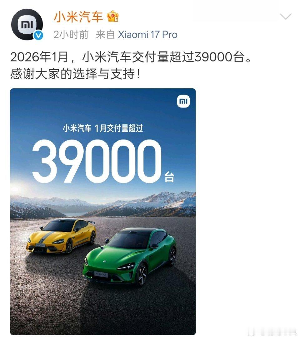 2026年小米汽车继续高歌猛进,1月交付39000辆。
