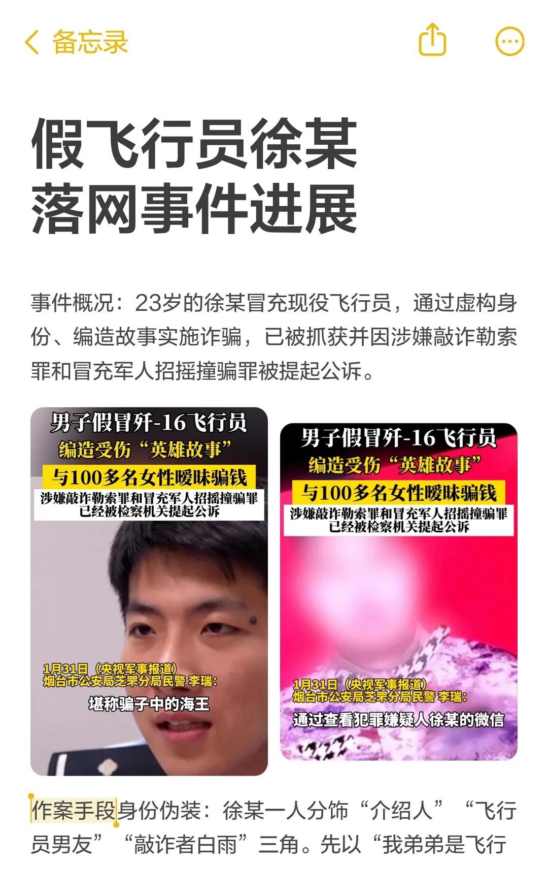假飞行员徐某落网事件进展 23岁男子徐某冒充飞行员诈骗,虚构身份、编造故事,获取信任后敲诈20万。警方抓获其并起诉,揭露其与100多名女性的虚假关系。提醒军队人员不得在网上交友或暴露军人身份。诈骗 欺骗 飞行员 山东