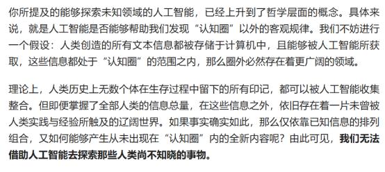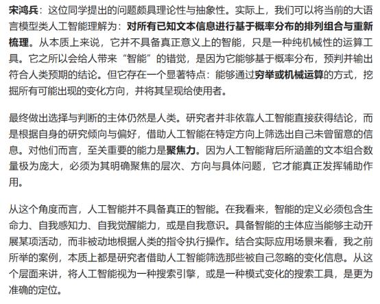 我们可以将当前的大语言模型类人工智能理解为:对所有已知文本信息进行基于概率分布的排列组合与重新梳理。从本质上来说,它并不具备真正意义上的智能,只是一种纯机械性的运算工具。它之所以会给人带来“智能”的错觉,是因为它能够基于概率分布,预判并输出符合人类预期的结论。