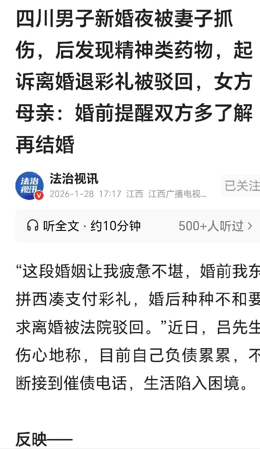 离大谱了!四川达州,一男子新婚燕尔,想和新娘做真正的夫妻,可妻子拒绝,一把抓他脸上,男子脸被抓花,怀疑妻子心里有别人,妻子说自己是生 理期,男子耐心等了几日,谁知他刚想好事,妻子又把他脸抓花,男子一气之下,离家出走,半年才回来,他打开柜子,发现一瓶“利 培 酮 片”,上面写着妻子名字,这是一种JS 类药物,男子怀疑女子骗婚,他告到法院,要求和妻子离婚,并返还11万彩礼,结果令人意想不到! 2025年10月的一个下午,四川达州的秋风带着几分湿冷的寒意。 刚从外地务工回来的吕某,在自家卧室内拉开了一扇普通的衣柜门。 这本是一个再寻常不过的举动,却成了他整个人生急转直下的分水岭。 柜子深处静静躺着一个白色药瓶,瓶身上打印着妻子的名字:李巧。而比名字更刺眼的是那一串化学名词——“利培酮片”。 对于普通人来说,这四个字或许只是一串生涩的符号。但当吕某颤抖着手查阅说明书时,冰冷的药理名词瞬间击碎了他所有的侥幸:这是一种专门用于治疗严重精神分裂症的强效药物。 这一刻,时间仿佛在他脑海中发生了一场惨烈的回溯。那场耗资不菲的40桌盛大酒席、那叠厚达11万元的彩礼现金,以及那个戴着眼镜、斯文儒雅的前教师妻子,所有的画面都在这个药瓶面前崩塌成了碎片。 故事的伏笔早在2025年1月21日那场婚礼上就已埋下。那天,38岁的货车司机吕某觉得自己终于熬出了头,有房有车,娶的还是个比自己小8岁的大学生。 然而,洞房花烛夜并没有等来预期的温存。 当宾客散去,吕某试图拥抱新婚妻子时,回应他的不是娇羞,而是一记狠辣的抓挠。李巧的手指在他脸上留下了数道血痕,理由听起来尚且算正常:“生理期,不方便。” 吕某是个老实人,他信了。为了遮掩脸上的伤,第二天回门时他只能尴尬地向岳家解释是“摔了一跤”。 真正让人脊背发凉的,是几天后的第二次冲突。当吕某再次试图亲近妻子时,李巧的反应升级成了某种歇斯底里的防御。 她死死护着身上的被子,再次抓向丈夫的面部,喊出的理由却让人摸不着头脑:“这是妈妈买的被子,不许你盖!” 这句话没有任何逻辑可言。这已经不是简单的夫妻矛盾,而像是一种深层的认知障碍。那个戴着眼镜、在相亲时文质彬彬的“前教师”,在那一刻露出了一种令人心悸的陌生感。 这种无法解释的恐惧感,逼得吕某选择了逃离。新婚没多久,他便以此为由离家外出务工,一走就是半年。直到这次回家,那个写着“利培酮片”的药瓶,才终于让他看清了这场荒诞剧的剧本。 这不是性格不合,这是一场精心包装的“信息黑箱”。 根据《民法典》1053条的法理逻辑,一方患有重大疾病,有义务在婚前如实告知。利培酮片背后的精神类疾病,无疑属于这一范畴。 吕某觉得自己像个傻子,掏空家底娶回来的,是一个随时可能“爆炸”且隐瞒了隐信的陌生人。 愤怒的吕某将一纸诉状递交到了法院。他的诉求很直接:这属于欺诈,不仅要离婚,还要李巧返还那11万元的血汗钱。 他手里捏着那瓶药,还有脸上曾经痊愈又复发的抓痕,觉得胜券在握。 但司法博弈的现场,往往比生活本身更具戏剧性。 被告席上的李巧坚决不离,她的一句“我们有过夫妻之实,感情没破裂”,像一团棉花堵住了吕某的呐喊。 而真正锁死这场判决的,竟然是一个微不足道的数字痕迹。 法院在审核双方资金往来时,抓取到了吕某曾向李巧转账过的一笔款项——520元。 在当代社会的语境中,这三个数字被赋予了“我爱你”的特殊含义。 在这个严肃的法庭上,这笔转账成了判定“感情尚未彻底破裂”的强力锚点。 一边是治疗精神分裂的冰冷药瓶,另一边是象征爱意的520元转账,司法的天平在这一刻发生了微妙的倾斜。 判决结果下来了:驳回离婚诉求。 这不仅仅是一个“离大谱”的判决,更是一次关于婚姻本质的冷峻拷问。虽然法律层面给了双方一个看似充满希望的“冷静期”,但在现实的泥沼里,吕某面临的是一个死局。 那瓶利培酮片并没有消失,它依然立在柜子里,像一座沉默的墓碑,埋葬了吕某对婚姻所有的美好想象。 而那笔520元的转账,原本是示好的礼物,如今却成了一道无法逾越的铁栅栏,将他困在了这段名存实亡的关系里。 如今已是2026年的1月,距离那场热闹的婚礼刚过去一年。对于吕某来说,这场梦醒得太快,也太痛。 他或许至今也没想明白,为什么诚实地掏钱娶妻成了错,而隐瞒病史的人,却能躲在“感情未破裂”的保护伞下,继续维持着这段摇摇欲坠的婚姻。 信源:男子新婚夜被妻子抓伤,事后发现家中有精神类药物,起诉离婚退11万彩礼!法院判了 2026-01-29 07:05