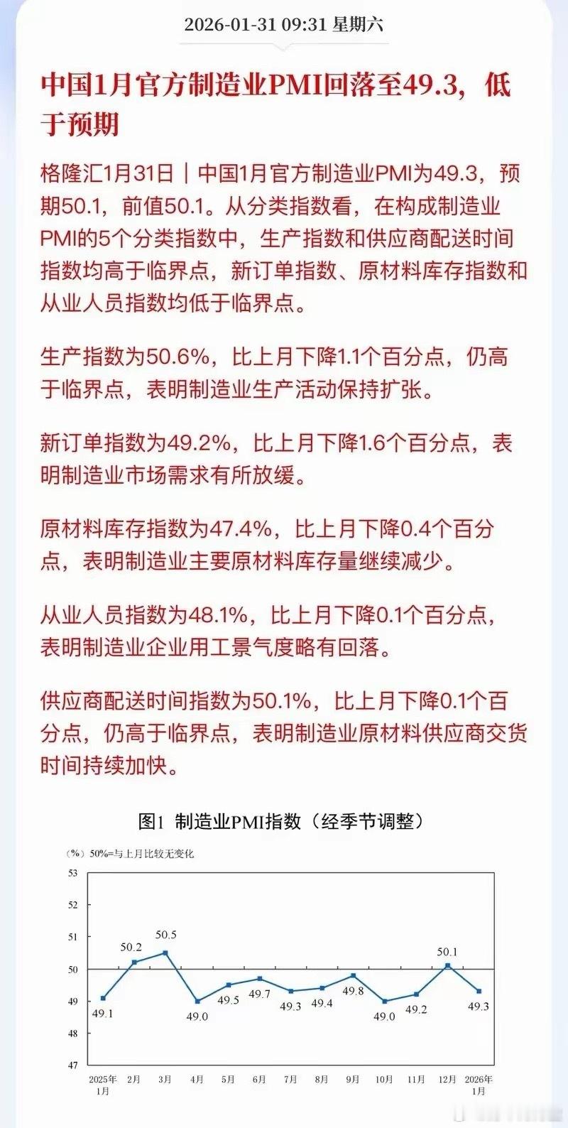 1月份官方制造业PMI数据出炉,这49.3远低于50.1的前值和预期,生产订单、新订单、原材料库存、从业人员等具体数据,均大幅降低。