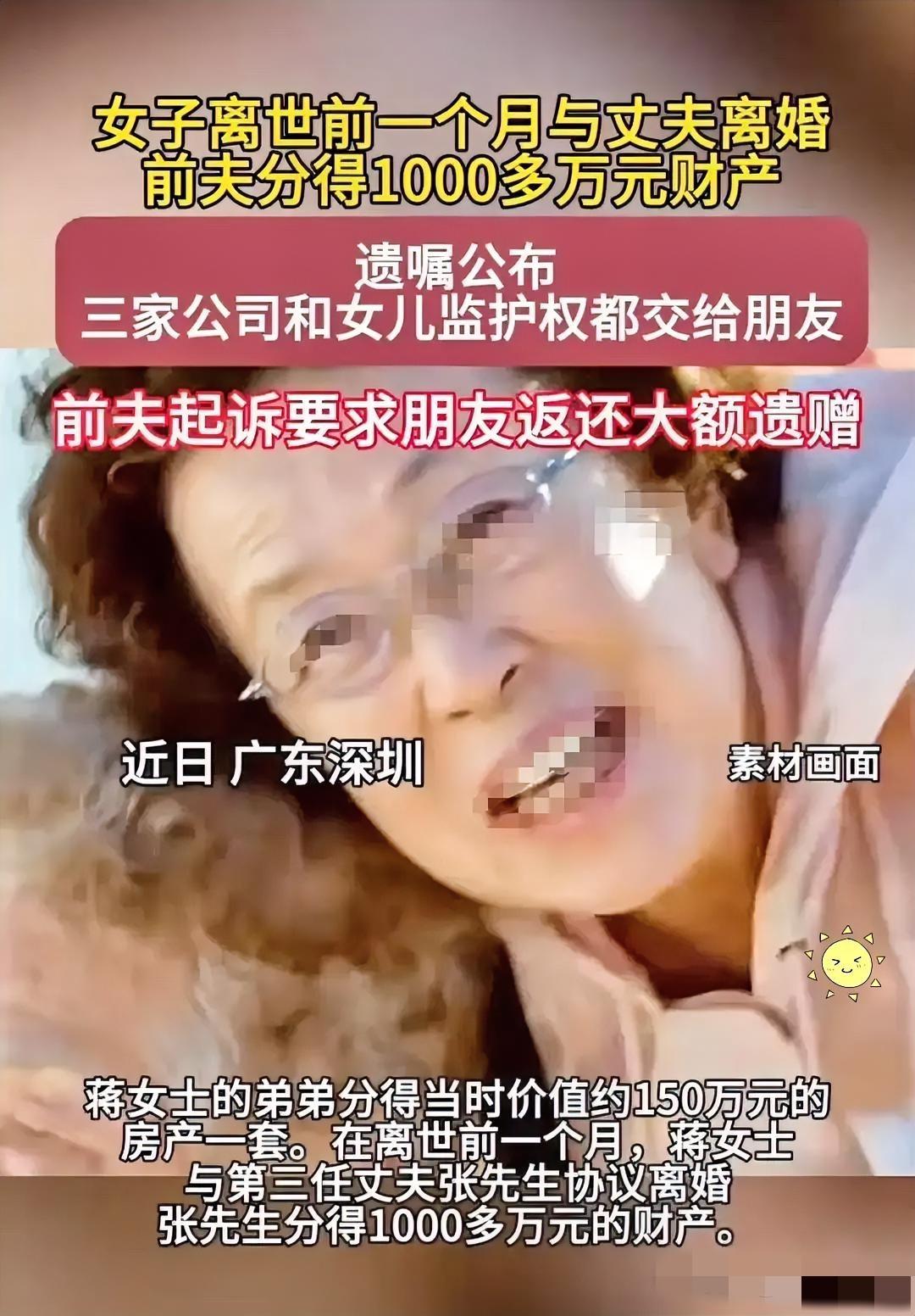 深圳有个女老板,真叫一个厉害。自己快不行了,先甩给老公1000万,让他赶紧离婚走人。然后立下遗嘱,把几个亿的家产,大部分都给了一个外人,自己的亲妈一分钱没给。 刷到这个流传甚广的真实原型事件时,我没有像多数人一样只看热闹,反而看清了当代独立女性最扎心的生存真相,这不是狗血八卦,是无数打拼者藏在心底的无奈。 网络上总把这件事扭曲成绝情忘本,可大家忽略了最核心的逻辑:财富是她一分一厘拼出来的,不是继承而来,支配权天然只属于她本人,和血缘身份没有强制绑定关系。 很多人陷入中国式亲情误区,觉得生养就等于无限索取,却忘了亲情的本质是双向奔赴,一味消耗、病中缺位、只盯家产的关系,早就失去了被优待的底气。 根据《民法典》第一千一百三十三条明确规定,自然人可以立遗嘱将个人财产赠与法定继承人以外的组织、个人,这是法律赋予的完整权利,并非大逆不道。 现实里太多人被道德绑架裹挟,生前不敢规划,死后亲人反目成仇,房产股权争得头破血流,真正想守护的孩子和心愿,最后全都落了空。 这位女老板最让人佩服的,不是敢不给亲妈分财产,而是重病之际依旧清醒,用合法方式切断消耗型关系,把托付留给长期靠谱、有担当的人。 我一直坚持一个全网少有人提的观点:血缘是出厂设置,不是终身特权,值得继承的从来不是姓氏,而是彼此支撑的情义与不离不弃的陪伴。 多数情感号只谈绝情与孝顺,却没人点破关键,这类遗产事件的本质,是成年人对无效社交、消耗型亲情的终极断舍离,是自我保护的最高形式。 对于普通家庭而言,这件事也有实用参考价值,提前了解遗嘱订立、财产公证的基础流程,能避免身后无数纠纷,这是对家人最负责的安排。 真正的通透,不是不顾情面,而是不委屈自己、不迁就恶人,把真心和财富都留给值得的人,不被世俗偏见绑架,不被虚无的孝道裹挟。 各位读者们对这件事怎么看?请在评论区留言。
