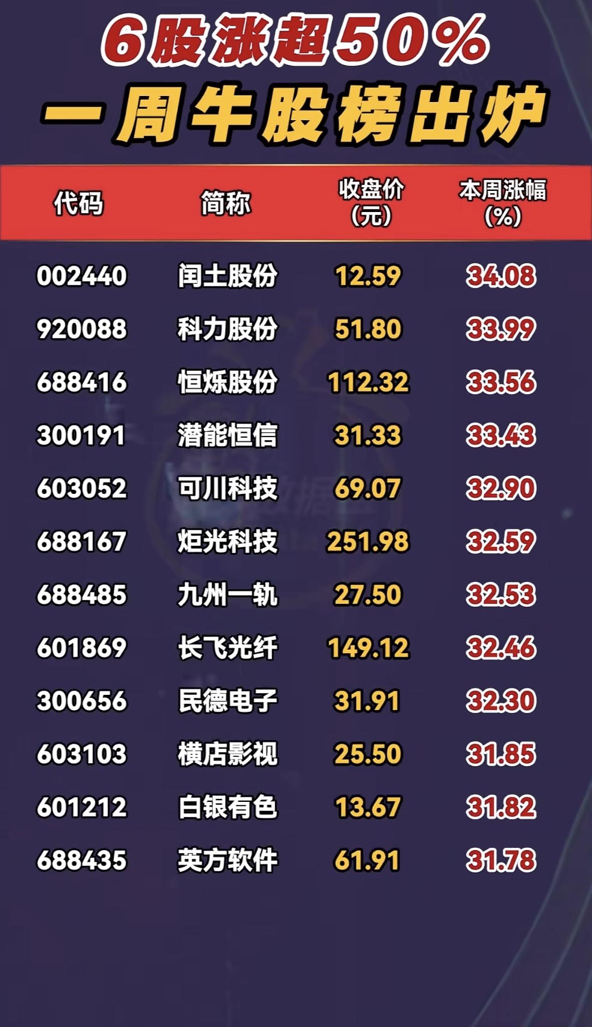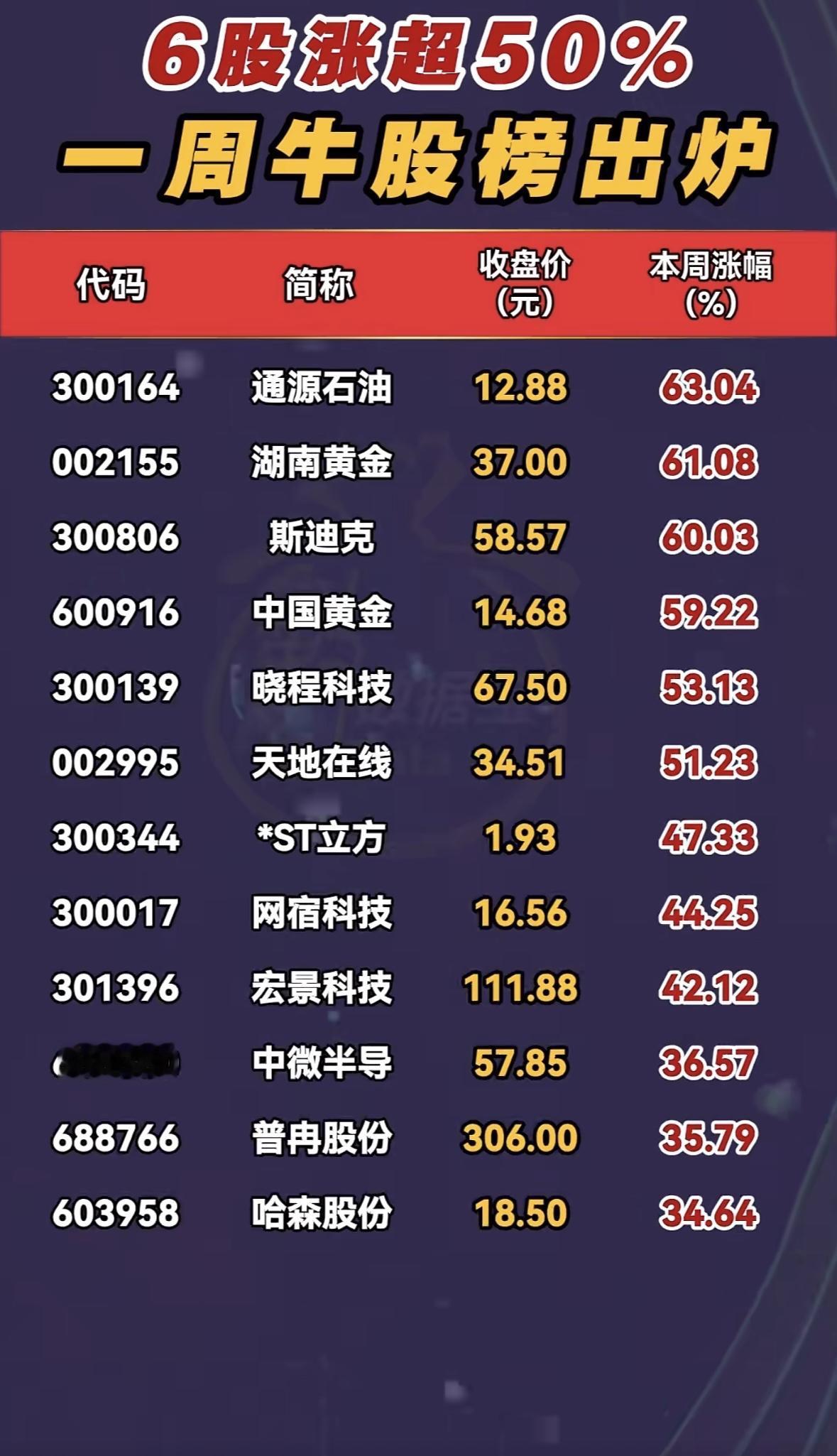 一周牛股榜出炉!6股涨超50%,快来抓住机会! 股市周报:通源石油领涨37%,湖南黄金、斯迪克跟涨超50%,热门股集体