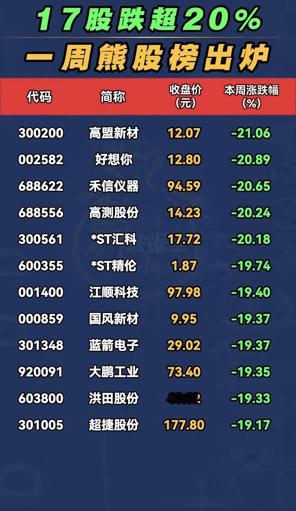 一周熊股榜出炉!17股跌超20%,注意风险! 股市寒潮来袭,多股惨遭重挫,跌幅惊人,投资者需警惕风险! 股市寒流来袭,多只个股暴跌超两成,ST板块领跌,投资者需警惕风险。