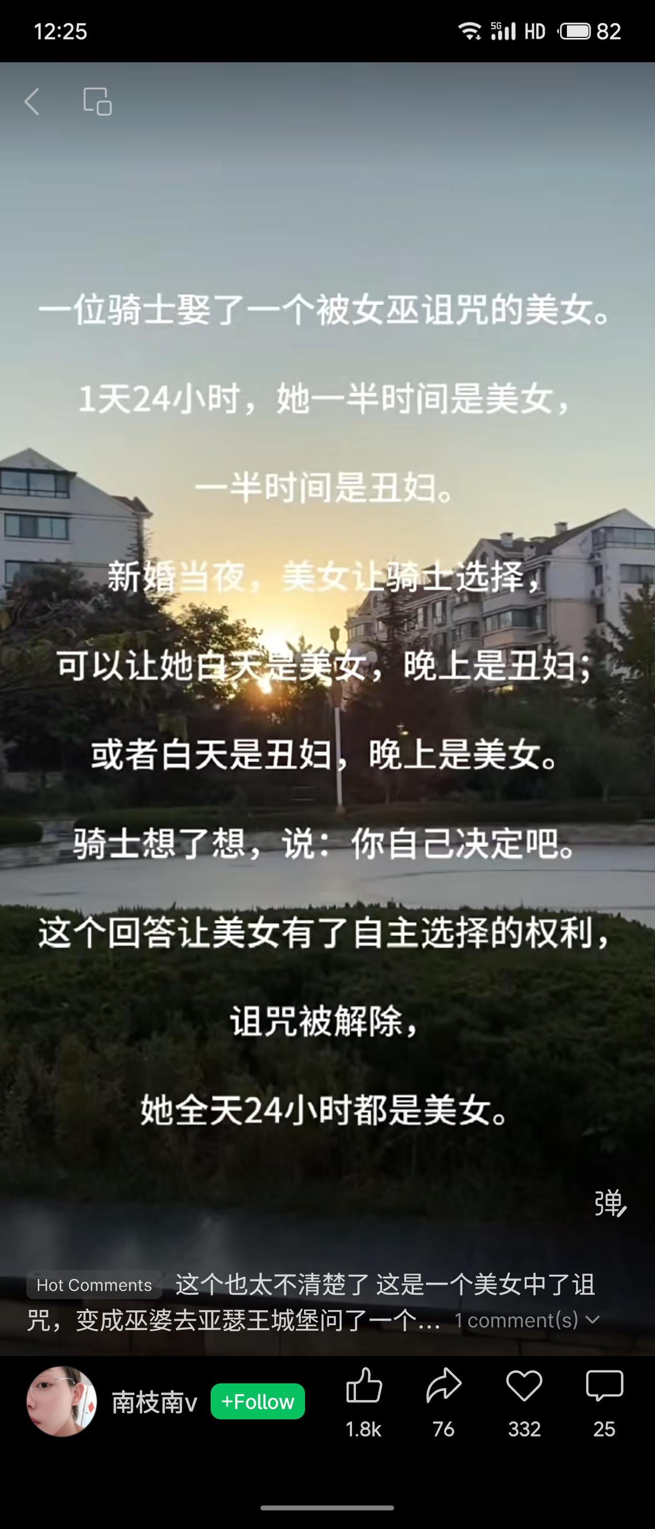 骑士娶了一位被诅咒的新娘:她每天一半时间美丽,一半时间丑陋,需骑士决定何时为美。骑士却将选择权交给她自己。新娘因获得自主权,诅咒被解除,从此全天都是美丽模样。
