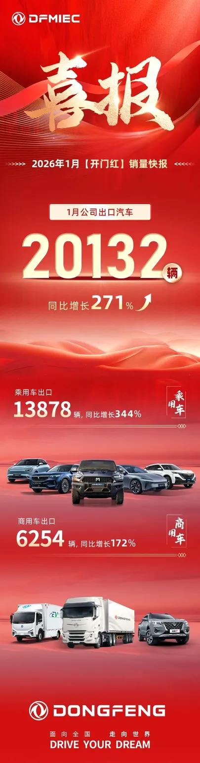 岚图1月销量10515辆,奕派科技1月销量21269辆。 1月嫡系东风出口20132辆,其中奕派+岚图+猛士乘用车出口13878辆,东风商用车+东风轻型车+东风皮卡出口6254辆。