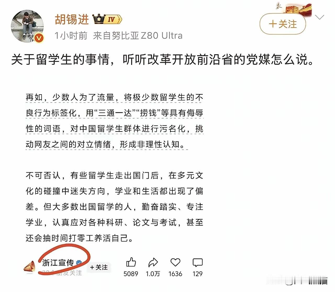 浙江发文驳斥牢A,要求理性看待留学生,其实这也没啥,谁不爱自己的孩子呢?谁不护自己的孩子呢?浙江地区本来经济发达,有条件把孩子送到国外,数量也是比其他地区要多,所以出来发声也就很好理解。 如果把这件事以偏概全,那就完全有点过度,自己的孩子是什么样的,当家长的应该最清楚,也没必要特意的澄清,解释,就像要求女方婚前体检,咱也可以要求男方婚前体检嘛,一样的道理。