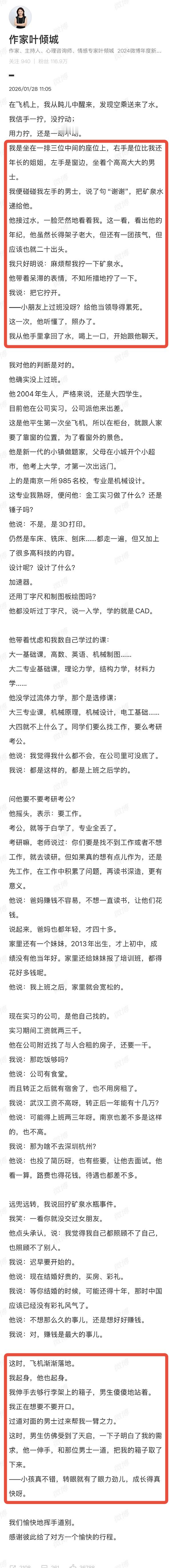 经常听别人谈论油腻男、中老登。现在我终于理解油腻女、女版中老登是什么样子了。女作家叶倾城一趟航班的功夫,给正在实习的理工科男大一通PUA。请人帮忙拧瓶盖、抬行李,却表现出极度高傲、没礼貌的样子,与人聊天妈味十足。文章中的学弟大概一辈子都会记得,有个油腻到发光的阿姨,在他人生第一次出差的飞机上,用最廉价的所谓“人生经验”对他进行了公开处刑。这不是温情,这是中年油腻女对年轻男性最经典、最下作的权力快感表演。她享受的根本不是聊天,是居高临下的羞辱与收编,是把一个还没长硬翅膀的学生按在“社会课堂”里当活体标本。恶心、油腻、腐朽、恶毒。真的是带有一股腐朽的棺材气息。过去我不懂,现在我懂了,懂得想吐。