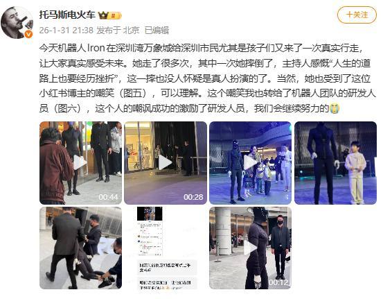 小鹏汽车副总裁 称,机器人 IRON 在深圳湾万象城给深圳市民尤其是孩子们又来了一次真实行走,让大家真实感受未来。她走了很多次,其中一次她摔倒了,主持人感慨“人生的道路上也要经历挫折”,这一摔也没人怀疑是真人扮演的了。