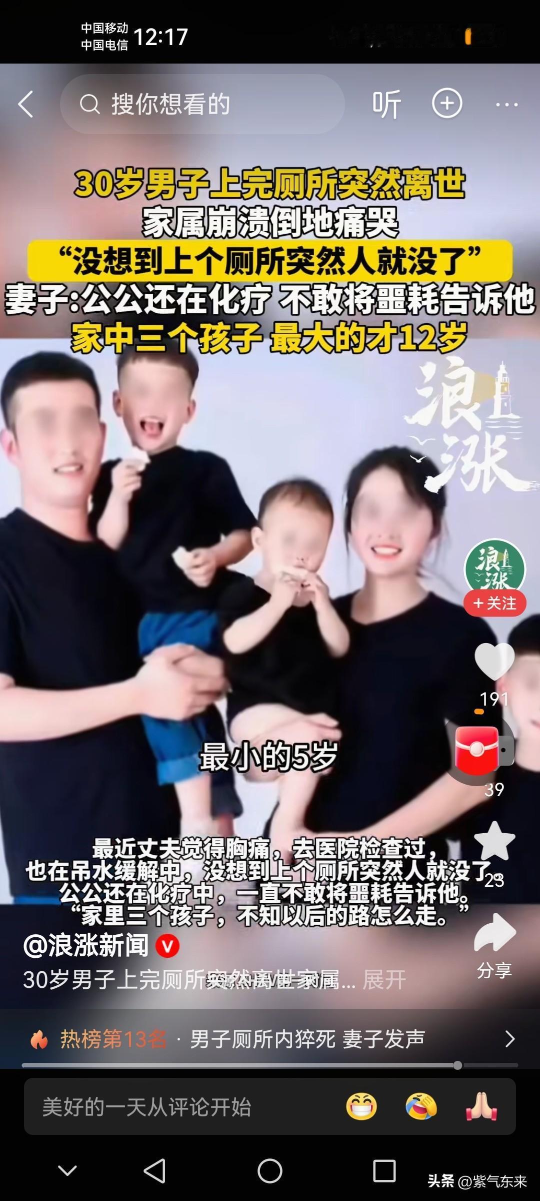 大家有没有发现 现在猝死的中年男人越来越多,年纪轻轻40来岁,撒手人寰,留下妻儿老母,这是何等的不值得! 这位男士上个厕所人就没了,留下三个孩子和妻子,最小的孩子五岁,自己的父亲还在化疗,就这样猝死走了,让孩子让妻子怎么活怎么过! 熬夜、抽烟、喝酒、压力大等等都会导致猝死。 凡事看开看淡,一念放下万本皆顺! 人这一辈子除了生死没啥大事! 男人一定要对自己好点,压力大了该歇歇,该吃吃该喝喝!