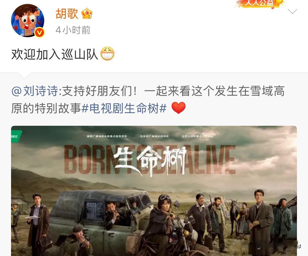 2月1日,刘诗诗凌晨为《生命树》剧宣 胡歌一早回复呲牙笑称欢迎她加入巡山队,杨紫虽迟但到,中午紧跟回复谢谢姐姐 这应该是刘诗诗自发为杨紫胡歌新剧做的剧宣,如果没人提醒,杨紫胡歌不上网可能都不知道这事,侧面证实了刘诗诗真的很好! 刘诗诗胡歌十几年的情谊自不用说,杨紫刘诗诗虽然没有一起合作过,但两人有共同的商务经纪人,私下接触的也多,之前两人就经常帮对方做剧宣,是友好的小姐妹关系 刘诗诗后面也有三部待播剧,互相支持与期待刘诗诗 胡歌