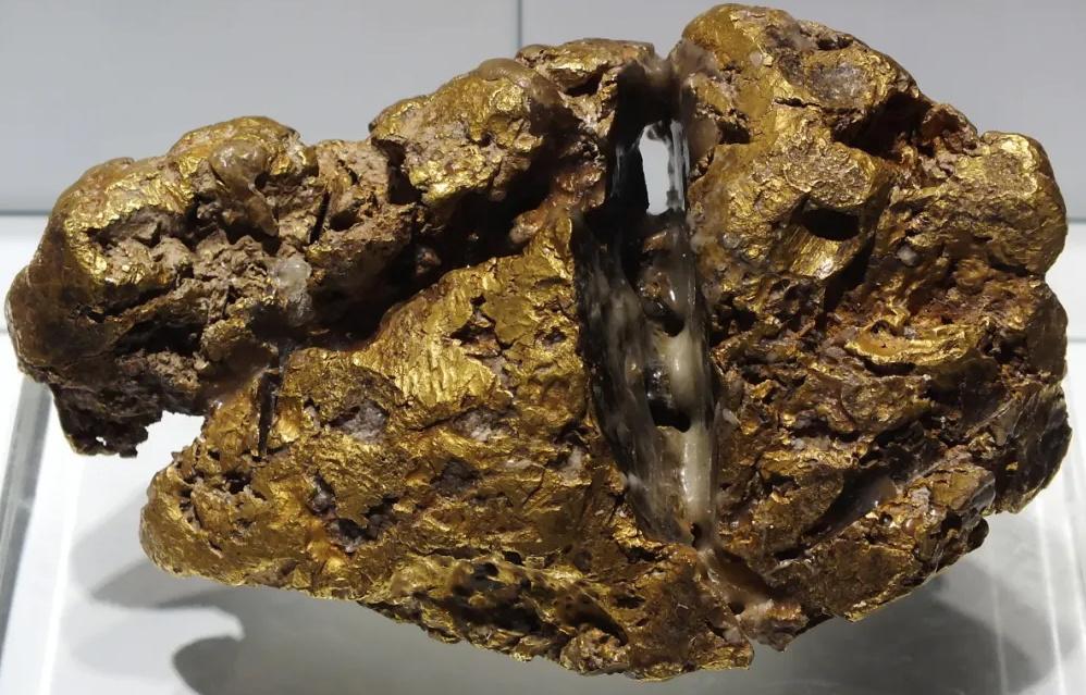 狗头金,它是大自然里偶尔长出来的“大金疙瘩”,因为很多块长得圆乎乎、坑坑洼洼、有点像狗头,民间就统称它为“狗头金”。 普通金矿里的黄金颗粒超级细小,要聚集成几斤、几十斤的大块,需要极苛刻的条件:长期的地质迁移、含金溶液沉淀、甚至可能有微生物帮忙富集,才偶尔形成一块。 所以捡到狗头金基本等于中彩票。