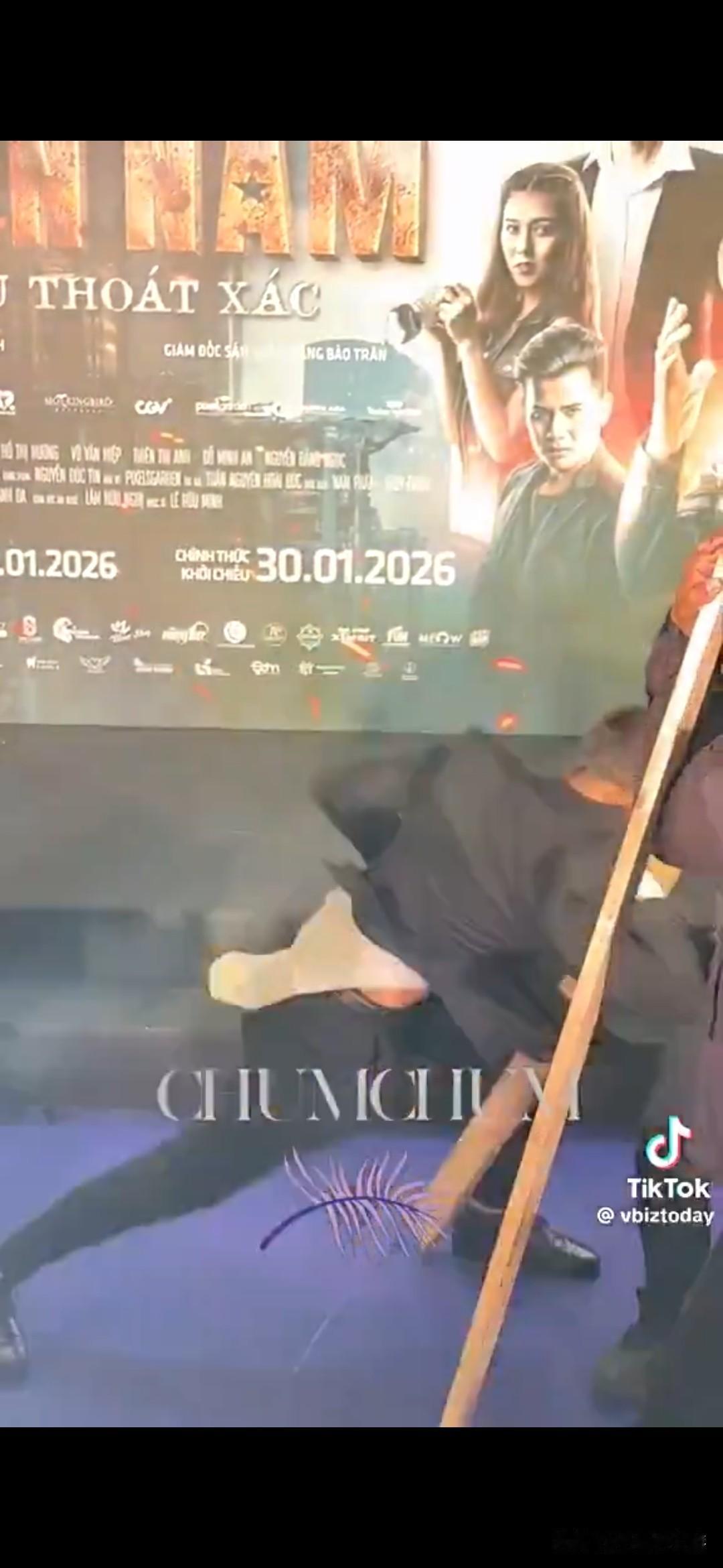 越南的一场电影宣传活动,原计划由特技演员表演徒手断假木板,结果有人把假木板换成了真木板。 表演者试着肘击好几次都没折断木板,导致表演失败,场面十分尴尬。