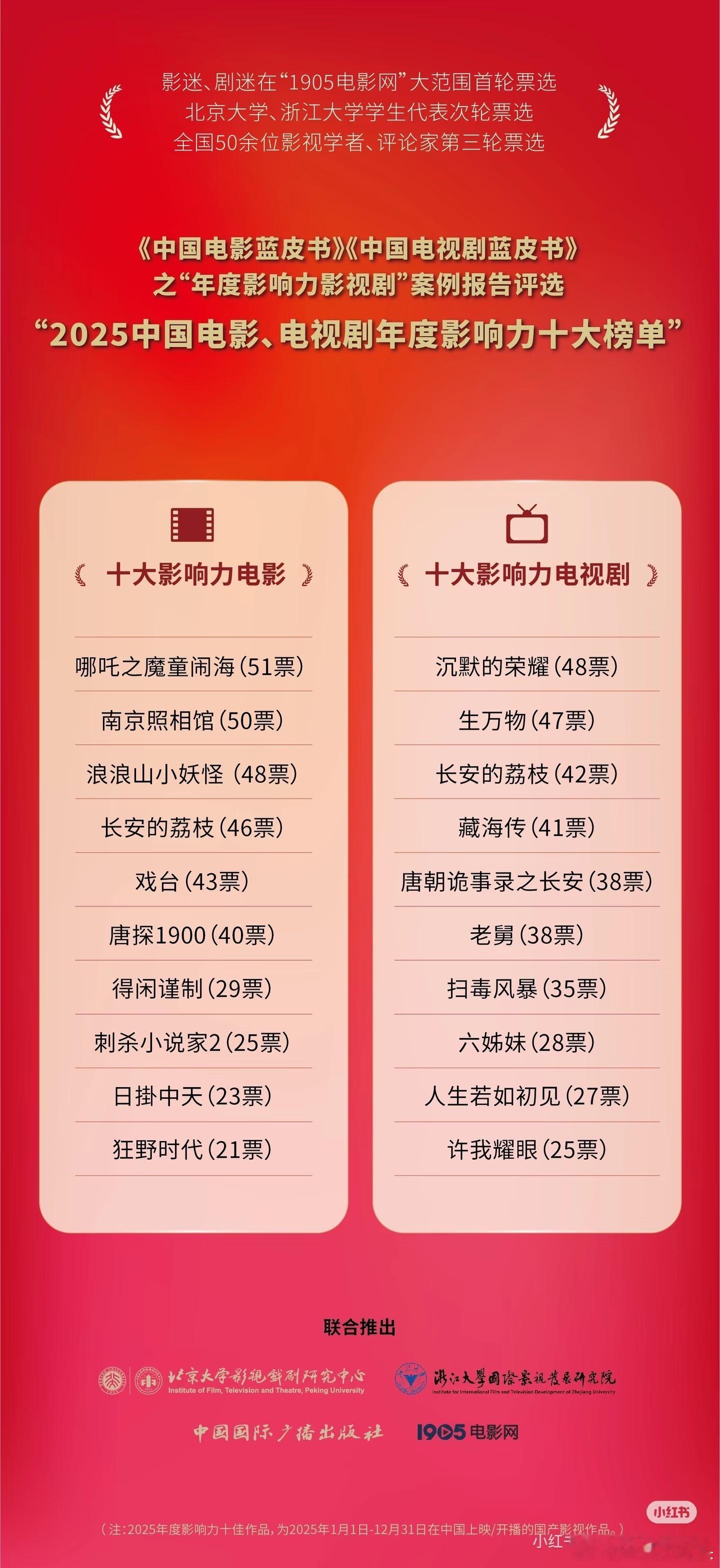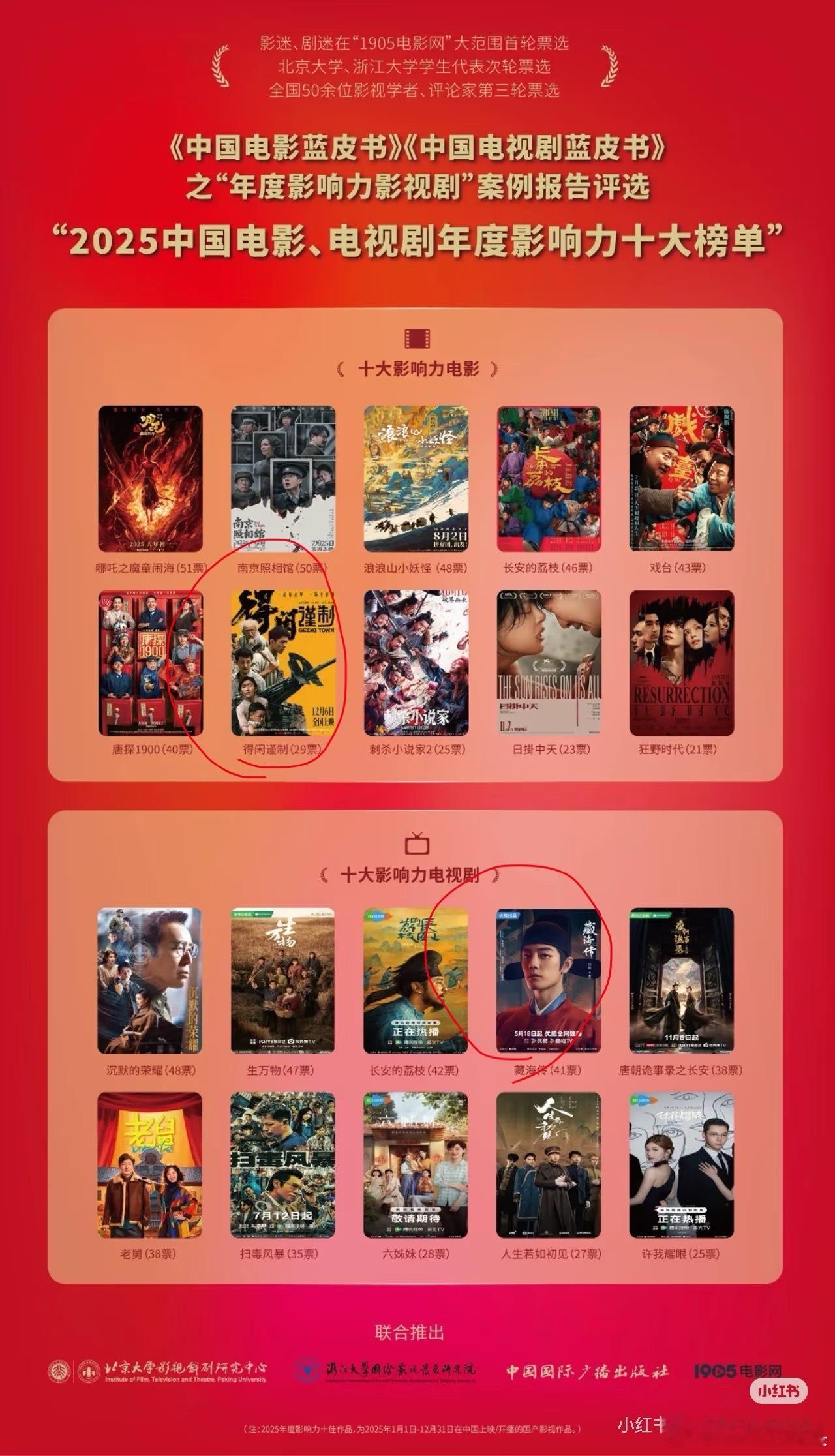 中国影视蓝皮书2025年度中国十大影响力电影和电视剧投票结果发布,肖战影视口碑双丰收,《得闲谨制》和《藏海传》全都上榜!投票方式是累计参与人次超90万次的影/剧迷,数百名北大/浙大影视专业学生,五十余位国内知名影视专家的三轮票选!