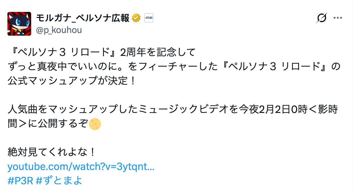 官方宣布,为庆祝《女神异闻录3 Reload》迎来2周年,将于今晚2月2日午夜(日本时间24:00,北京时间23:00)在油管发布多首人气曲目的混搭音乐视频,由ずっと真夜中でいいのに倾心演唱,现已公开了联动视觉图。女神异闻录3reload