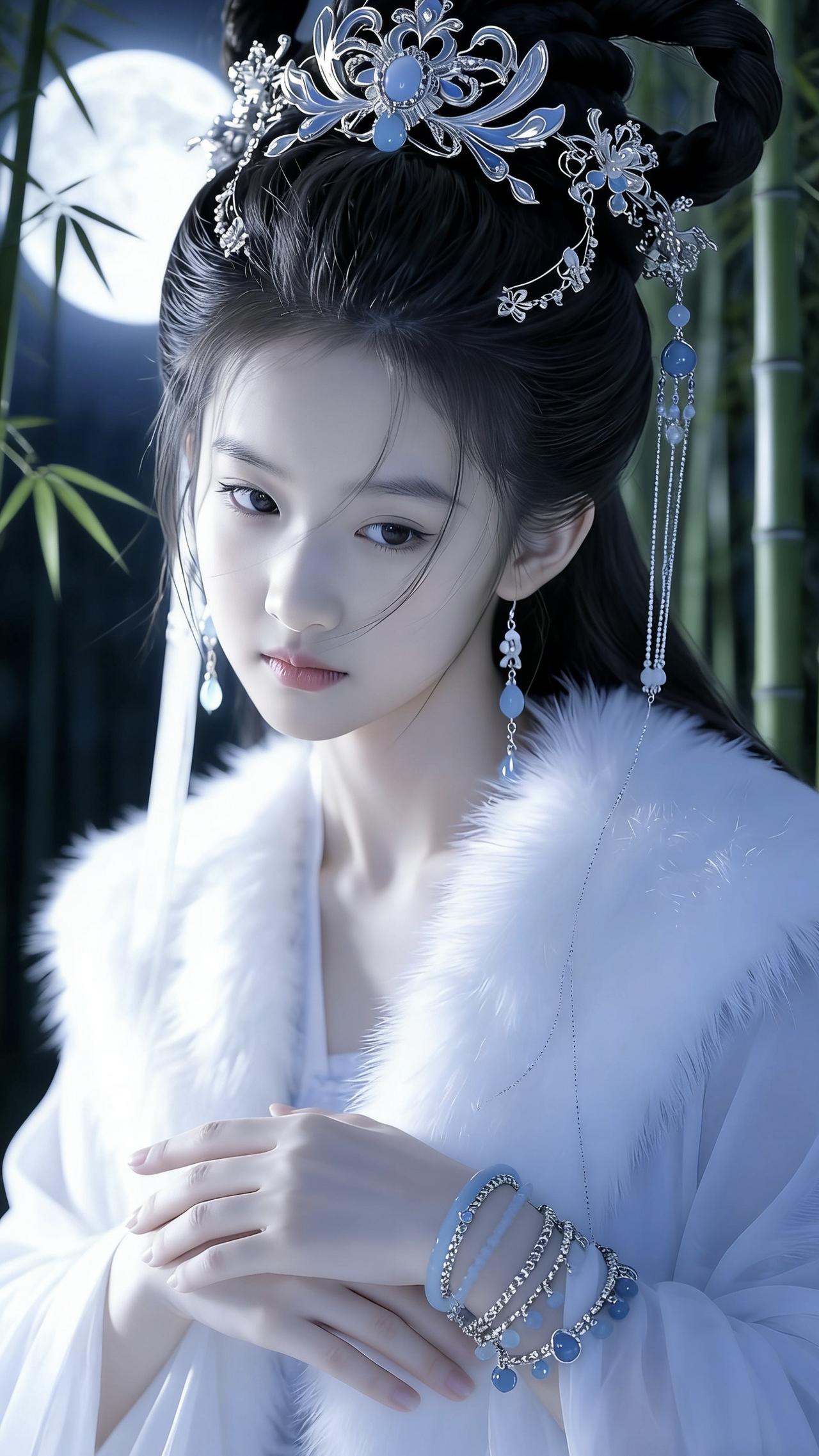 她身着一袭素白轻纱,外覆蓬松的白狐毛领,周身似浸着一层月色凝成的霜。乌黑长发梳成灵逸高髻,嵌着银蓝花丝发冠,垂下的银链流苏随着夜风轻晃,与耳坠上的蓝玉珠相映成趣。腕间叠着数串银蓝手串,衬得肌肤愈发莹白。 她垂眸敛着指尖,眉如远山含月,眼睫纤长,红唇微抿,神情里带着几分清寂的温柔。身后的竹林在满月下覆着薄霜,竹影与衣袂的白、发冠的蓝相映,晕出一抹清冷又柔和的意境。 你觉得她是在等赴约的故人,还是在独守这竹间月色?你猜她腕间的蓝珠手串,是月宫所赐,还是人间旧物?这满月下的竹林,会不会让她想起某个藏在山径里的旧约? 仙颜玉影 森间白裙仙影 竹影仙姬 竹影仙子 竹影梅狐 仙影白裙 仙狐古风写真