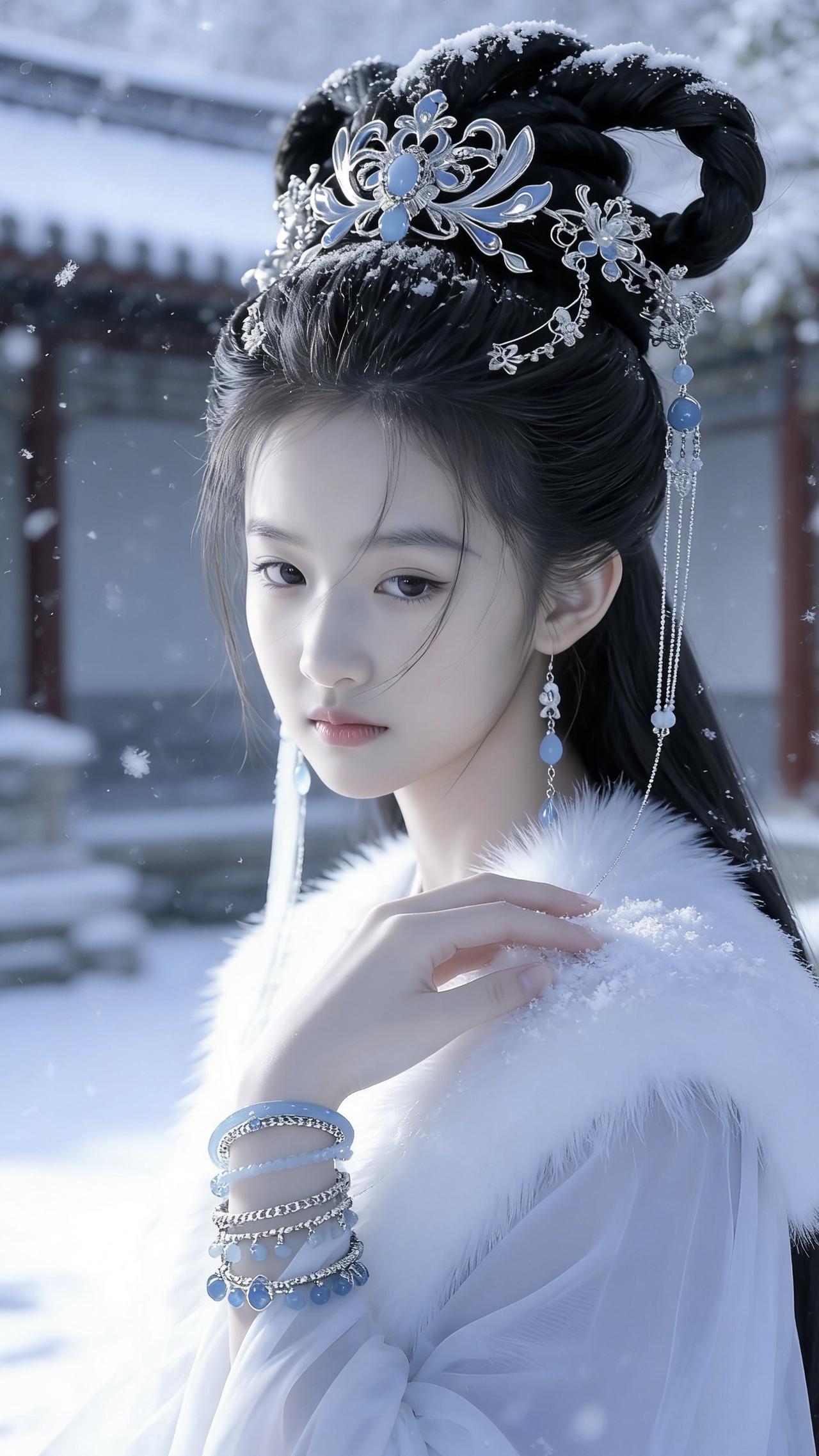 她身着一袭素白轻纱,外覆蓬松的白狐毛领,周身似裹着一团初雪凝成的云。乌黑长发梳成繁复高髻,嵌着银蓝花丝发冠,落雪沾在发梢,与垂下的银链流苏相映成趣。耳坠悬着蓝玉珠,腕间叠着数串银蓝手串,衬得肌肤愈发莹白。 她垂眸轻拂肩颈的落雪,眉如远山含雾,眼睫纤长,红唇微抿,神情里带着几分清寂的温柔。身后的古院覆着厚雪,朱红廊柱与衣袂的白、发冠的蓝相映,晕出一抹清冷又柔和的意境。 你觉得她是在等扫雪的故人,还是在独赏这满庭霜雪?你猜她腕间的蓝珠手串,是仙家信物,还是人间旧物?这雪天里的古院,会不会让她想起某个藏在红墙里的旧约? 古风雪狐 雪境华服写真 雪狐美女 灵狐风美女照 仙姿白狐 仙狐古风写真 灵狐古风写真