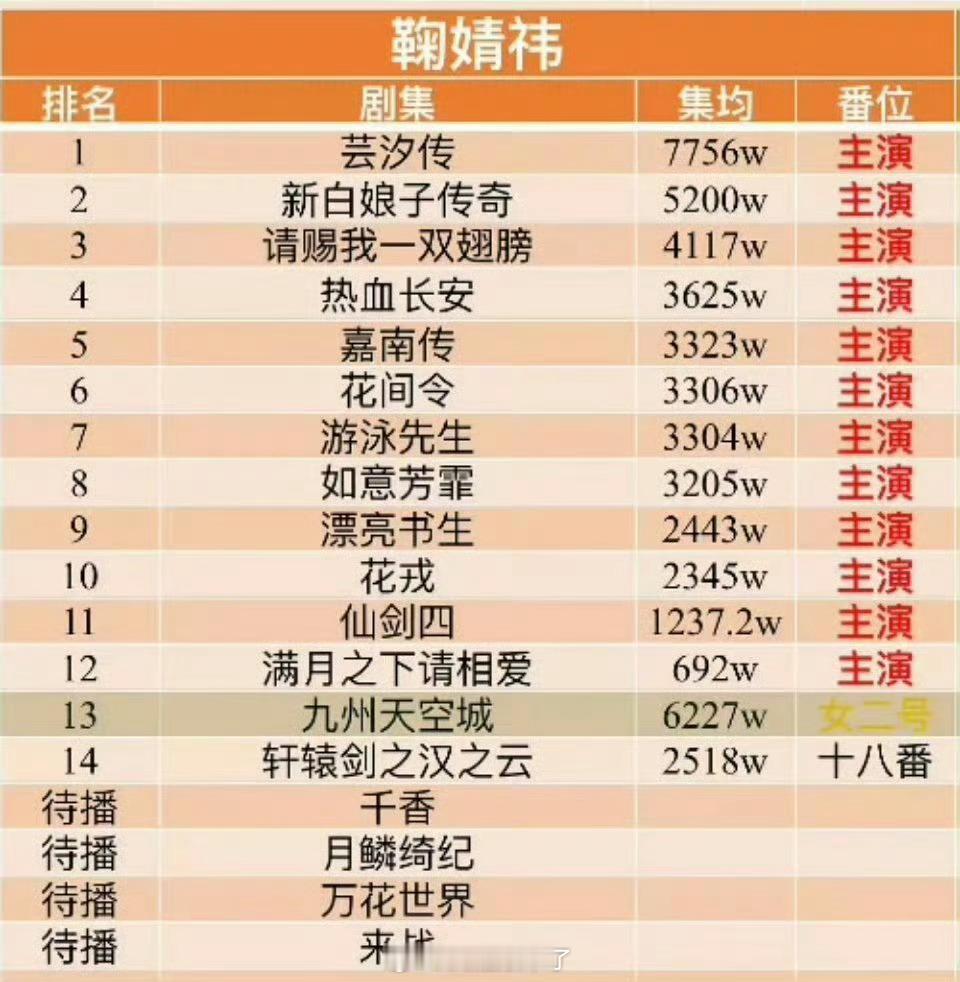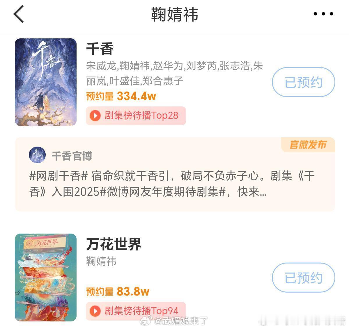 鞠婧祎单扛待播剧总预约破千万鞠婧祎四部待播剧《千香》《万花世界》《来战》《月鳞绮纪》总预约破千万历史主演剧集成绩也超能打不愧是女顶