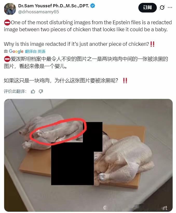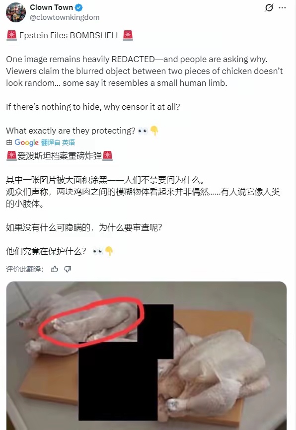 据多名X博主:爱泼斯坦档案中最令人不安的图片之一,是两块鸡肉中间不明物被涂黑的图片。如果这仅仅只是一块鸡肉,为什么这张图片要被涂黑呢?刚刚查询了美国司法部的网站,确实公布了这张图片。图片编号:EFTA01646032