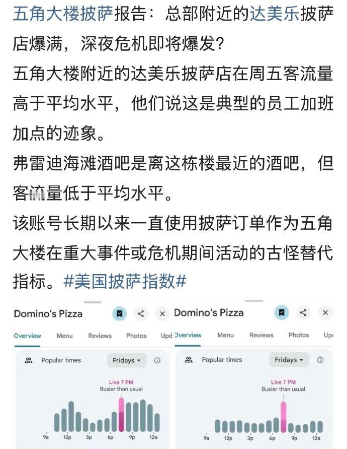 真是悲哀! 响当当的五角大楼,几千号员工,难道没有自己的食堂和厨师吗? 在五角大楼上班的人还要外出觅食,加个班没有夜宵,只能自个儿点披萨吃。 我在想,如果贾国龙的西贝开在五角大楼附近,凭借食材新鲜,出餐快,服务到位的一流服务,生意会不会火爆到怀疑人生。