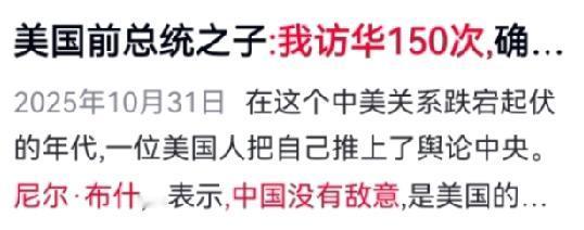 尼尔·布什喊话华盛顿:我访华超150次,中国没有敌意! 1974年,他的父亲老布什放弃英法大使职位,毅然赴任中国。当时北京物资紧缺,美媒嘲笑他“糊涂”,可老布什却骑着自行车穿行胡同,排队买油条,真切触摸到中国人的乐观与潜力。 这份坦诚影响了尼尔。1975年他首次来华,此后四十多年,他往返中美超150次,亲见中国从“小渔村”走向“世界工厂”。他参与新能源合作,推动青年交流,坚信中美企业共赢才是正道。 然而,当下不少华盛顿政客从未踏足中国,却大肆鼓吹“脱钩”“威胁”。尼尔·布什用亲身经历反驳:那些对抗言论多是谎言。读懂中国,必须真正走近她;发展中美关系,需要的是务实与理性,而不是偏见和选票炒作。 放下傲慢,看清事实,才能走出两国相处的正道。 对此大家怎么看?
