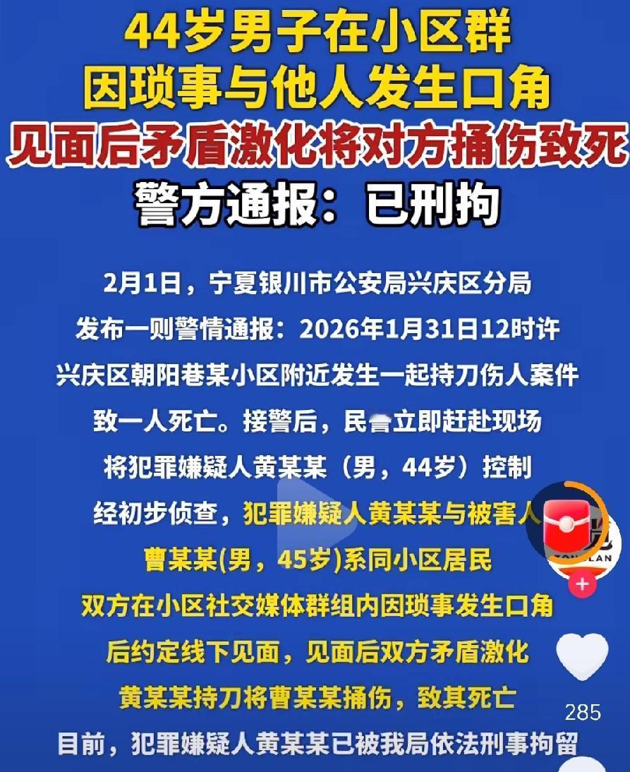 小区微信群吵架捅伤捅死人?当地网友透露,事发一个商城,卖水果店老板与保洁员,因为120块钱卫生管理费!两个人44岁、45岁,都这个年纪了,上有老下有小,怎么做事还这么冲动年轻气盛!快过年了,一个命没了,一个进牢房了,明年也没了,两个家庭的顶梁柱,这个年怎么过!冲动是魔鬼!警示每一个人! 以上部分内容来源于网络素材,真实性待证实,以及个人观点,仅供分享参考,引以为戒、避免悲剧!
