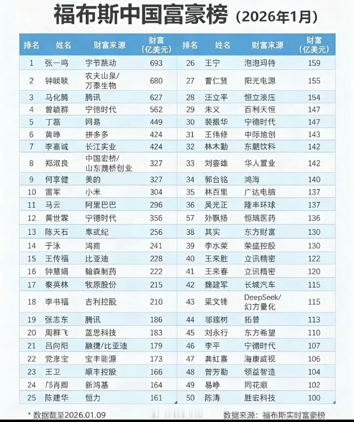 中国最新富豪榜出炉福布斯中国富豪榜,字节跳动的张一鸣以693亿美元位列第一名,钟睒睒第三,马化腾第三,雷军第十,马云以296亿美元位列十一名。