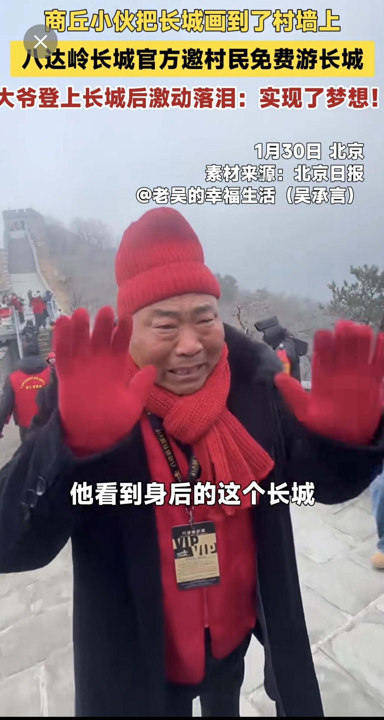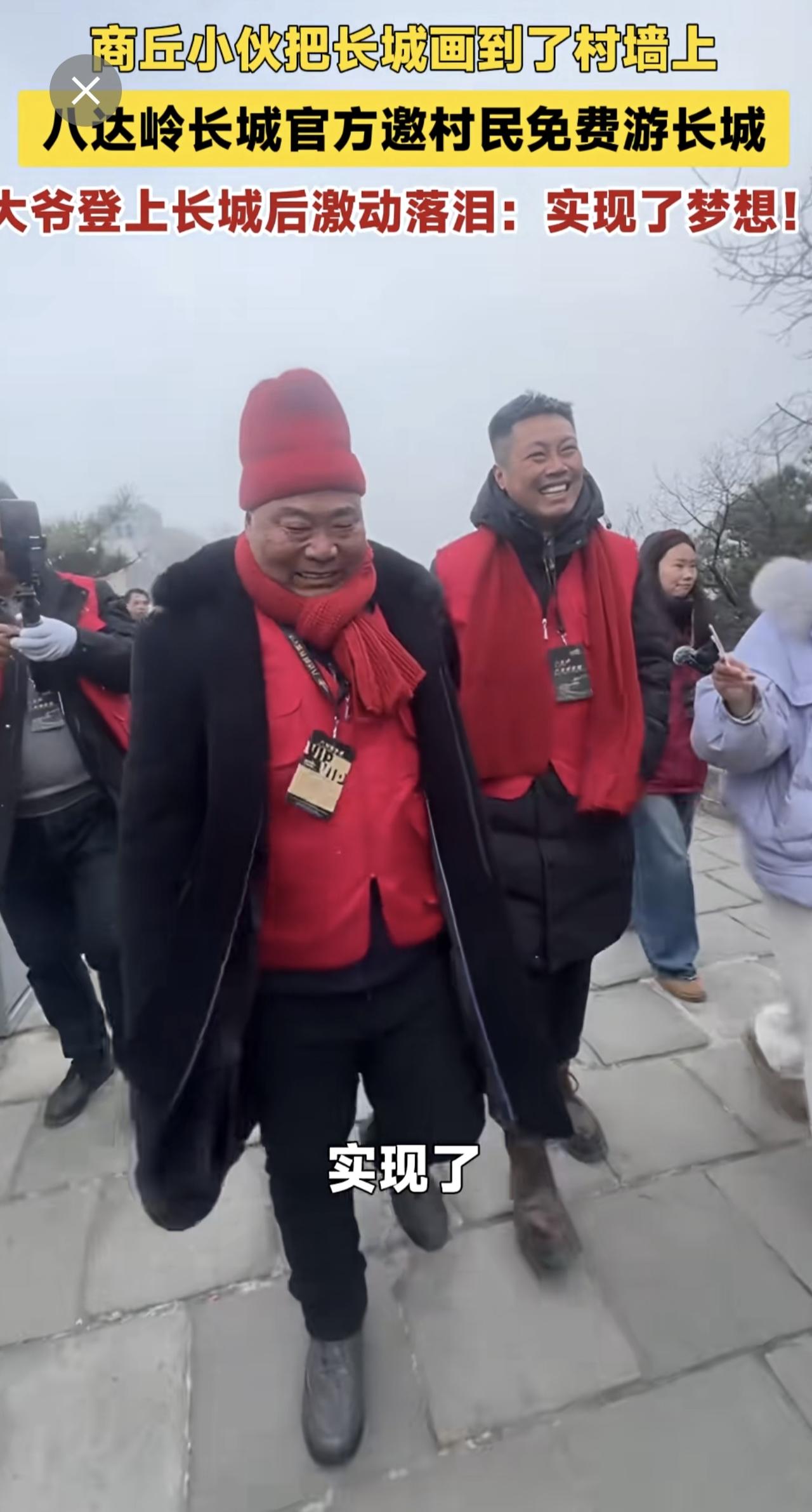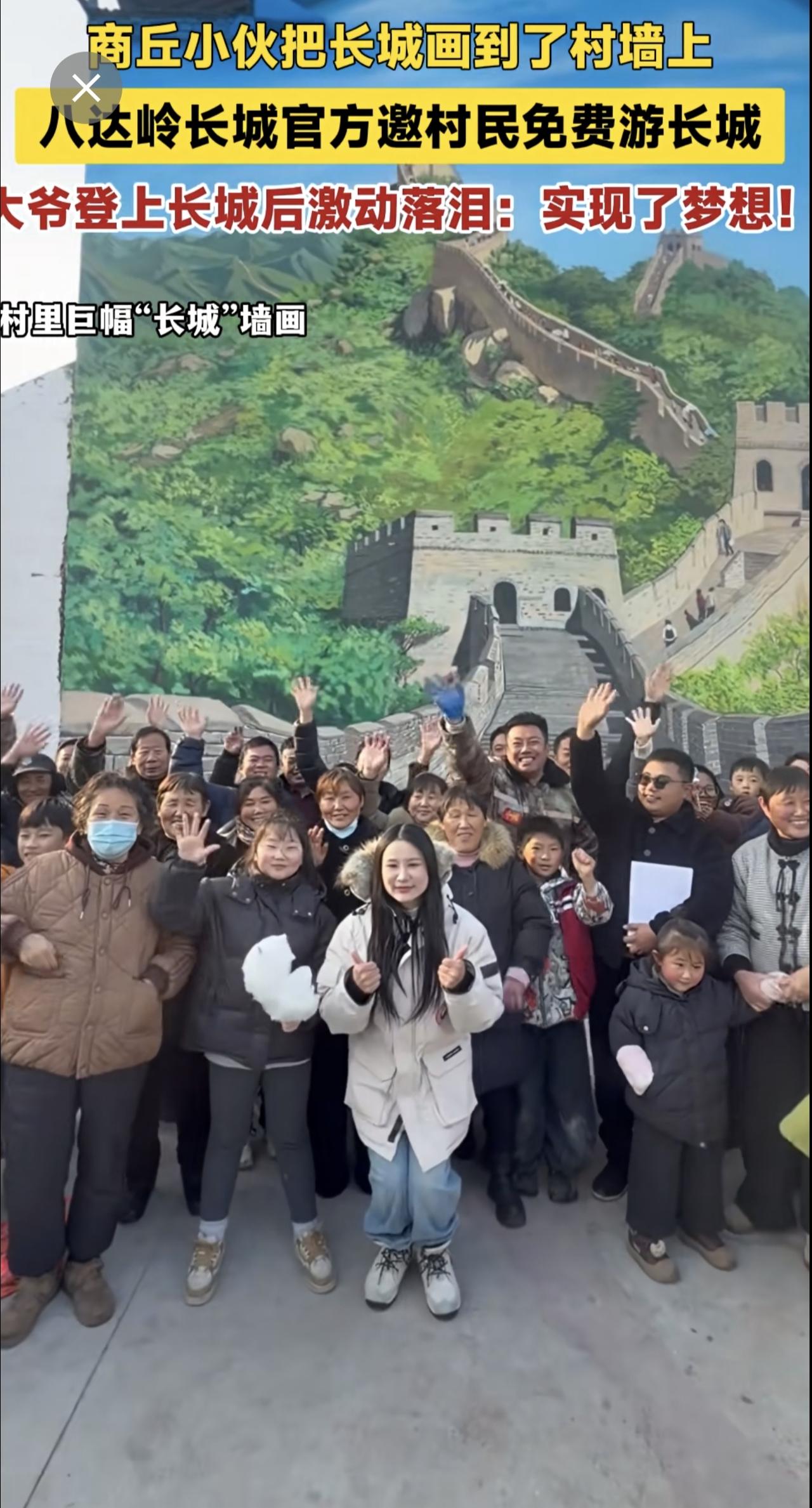 商丘小伙把长城画到了村墙上,八达岭长城官方邀村民免费游长城,大爷登上长城后激动落泪:实现了梦想!