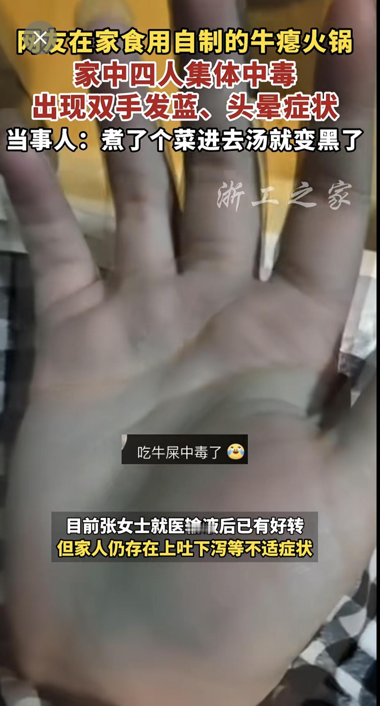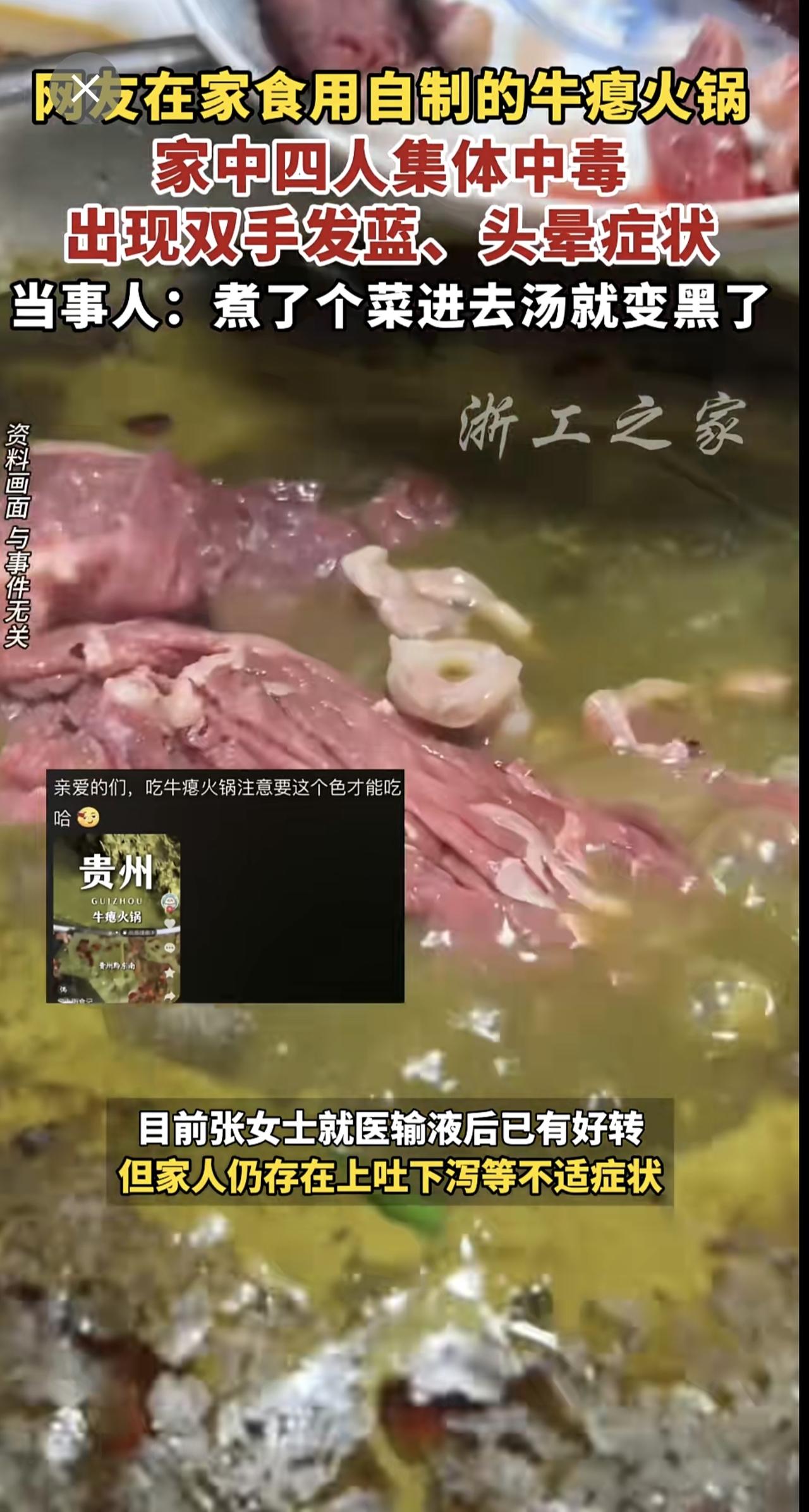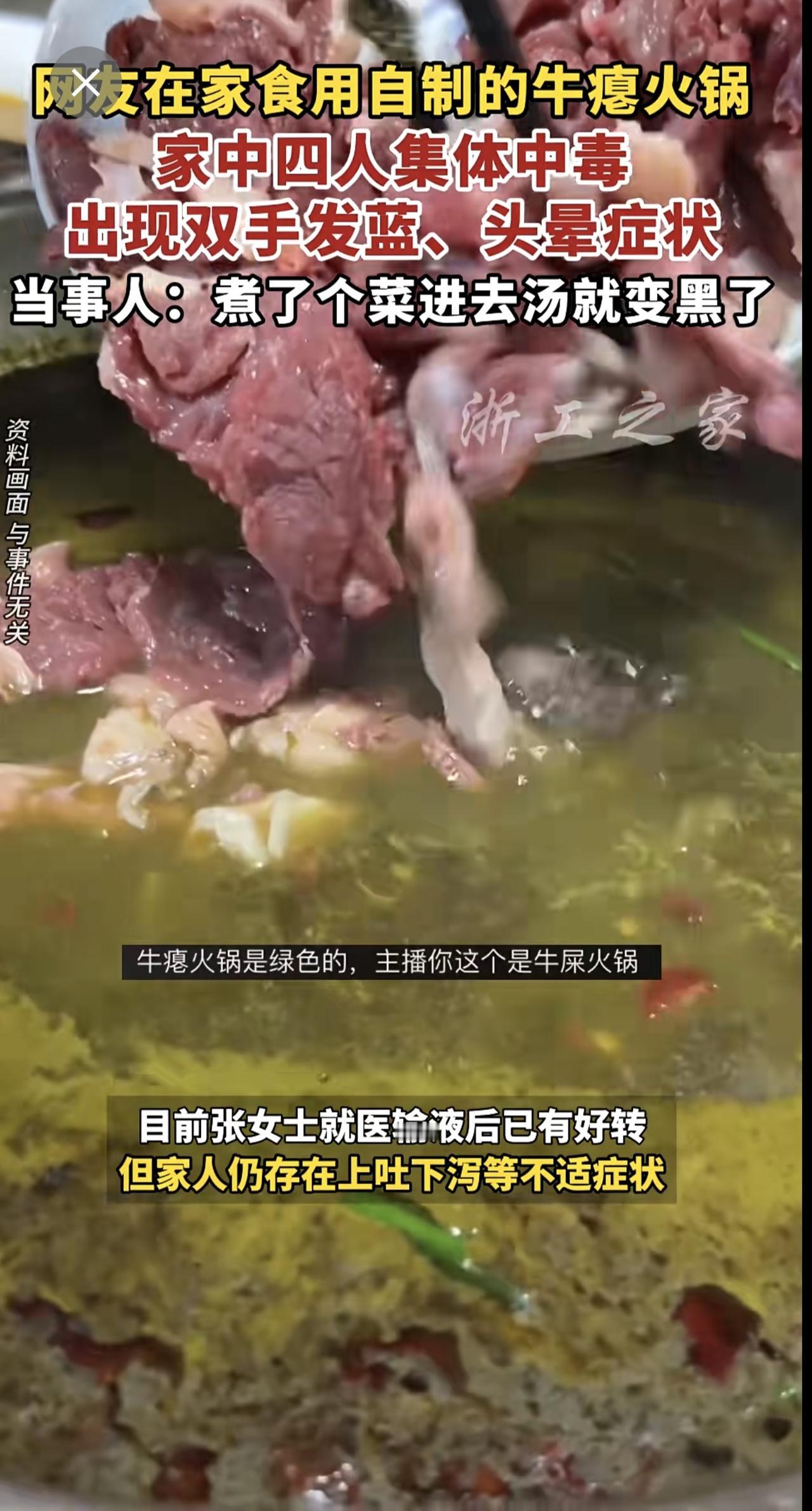 成都一家4口食用自制牛瘪火锅后集体中毒,手部发蓝、头晕、上吐下泻(来源:潇湘晨报、下场春雨)