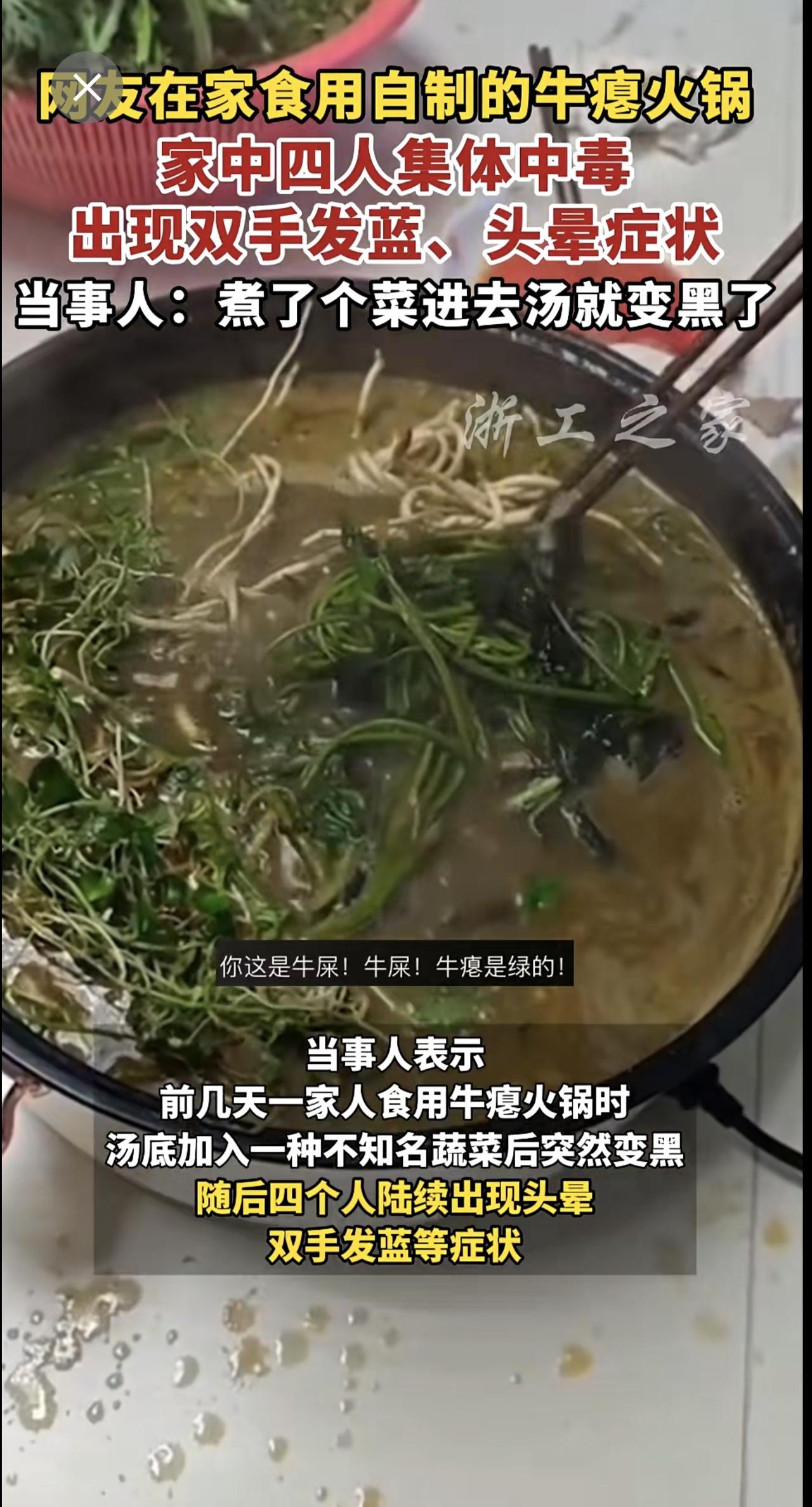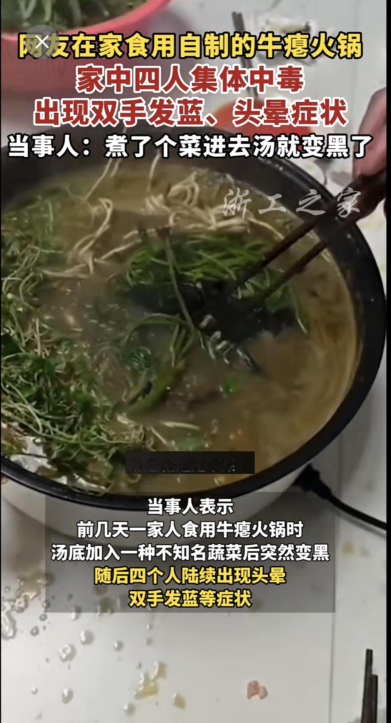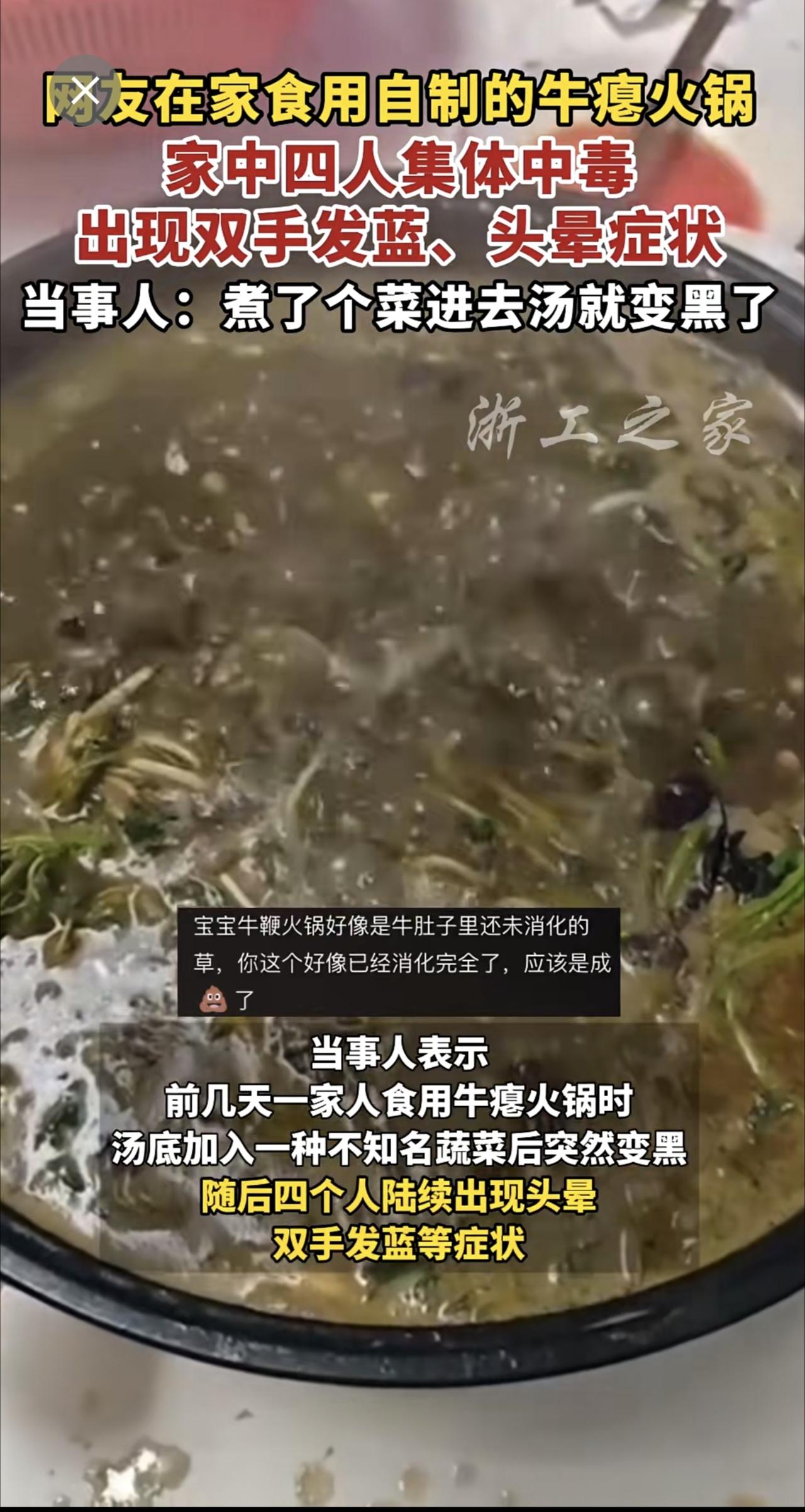 成都一家4口食用自制牛瘪火锅后集体中毒,手部发蓝、头晕、上吐下泻(来源:潇湘晨报、下场春雨)