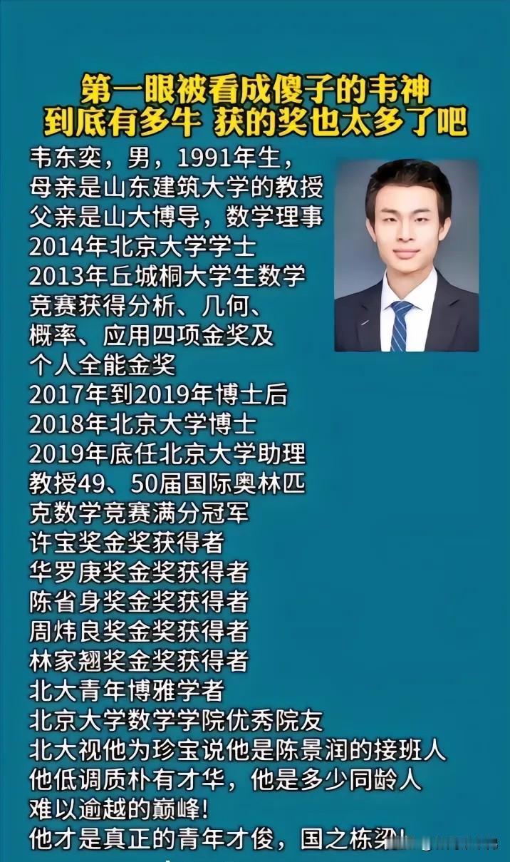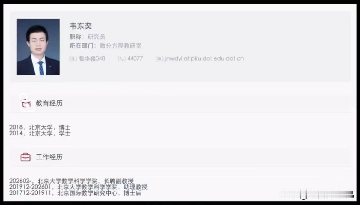 35岁“韦神”喜提北京大学长聘副教授身份!他一直是在自己喜欢和擅长的领域里发光,未来无可限量! 韦东奕在去年6月份入驻抖音,凭借一条只有4秒钟,3句话简介的视频,就圈粉2100多万,至今没再更新!这是多少自媒体人可望而不可即的! 然而韦东奕的眼里没有这些,粉丝数对他来说没有意义,也只是一串数字而已,他的眼里只有数学。真心希望他不受外界干扰,能专心做自己喜欢的事情,真的是一件非常幸运的事情! 韦东奕 韦神