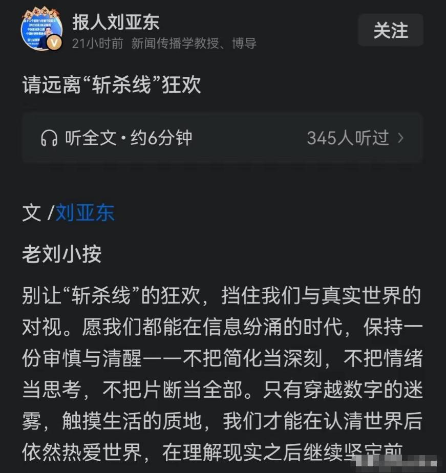 新闻学教授刘亚东1月31日一大早就发文说,中国人就该管好自己的事,不要通过“斩杀线”这个概念来“矮化”美国。 说实话,刘亚东喊停 “斩杀线” 矮化美国,不是理性中立,而是对中美竞争本质的认知偏差! 表面上看,不少人觉得这番话是清醒的理性之声,好像用 “斩杀线” 形容中美博弈是刻意矮化美国,有失客观,甚至认为国人该收起情绪、专注自身发展,不必过度关注对美评价。 然而,他们忽略了一个关键点:国人提及 “斩杀线”,从不是无端的矮化与抹黑,而是对美国霸权行径的客观回应,是看清美国为遏制中国设下各类技术封锁、规则壁垒后的清醒认知,所谓 “矮化”,不过是对霸权本质的真实揭露。 更重要的是,从芯片领域的层层制裁,到高端制造的技术封锁,从拉拢盟友构建排他性小圈子,到在国际舞台上动辄搞双重标准,美国为了维护自身霸权,不断为中国的发展设下各种 “红线” 与 “斩杀线”,试图从底层掐断中国的科技进步和产业升级之路。国人口中的 “斩杀线”,恰恰是对美国这种霸权行为的精准概括,是基于现实的客观表述,而非主观的矮化;管好自己的事,与认清美国的霸权本质并不矛盾,正视竞争才能更好地专注自身发展。 更讽刺的是,刘亚东一边呼吁国人管好自己的事、不要 “矮化” 美国,一边却对美国主动设下的各类 “斩杀线” 视而不见,对美国动辄遏制中国发展的霸权行径避而不谈。这种刻意要求国人 “单方面理性” 的做法,其实是陷入了片面的客观误区,把对霸权行为的揭露等同于刻意矮化,反而忽视了中美竞争中美国的主动挑衅与霸权本质,看似中立,实则是对现实的回避。 而这标志着,在中美全方位竞争的时代,理性看待自身与对手,早已不是单方面的 “收起情绪”,而是既要专注自身发展,也要认清对手本质,正视霸权才能更好地应对霸权。 说真的,未来的走向很明确:美国为维护霸权,针对中国的各类遏制手段只会有增无减,所谓的 “斩杀线” 只会越设越多;而国人只会更加清醒地认识到美国的霸权图谋,摒弃不切实际的幻想,在正视竞争的基础上坚定走自主发展之路,用实力突破各类封锁,而非一味的 “回避评价”。 说到底,提及 “斩杀线” 从不是矮化美国,而是对其霸权行径的客观认知;管好自己的事,更需要看清外部竞争的现实,正视问题才能解决问题,盲目要求 “单方面不评价”,反而不是真正的理性。 以上是小编个人看法,如果您也认同,麻烦点赞支持!有更好的见解也欢迎在评论区留言,方便大家一同探讨。