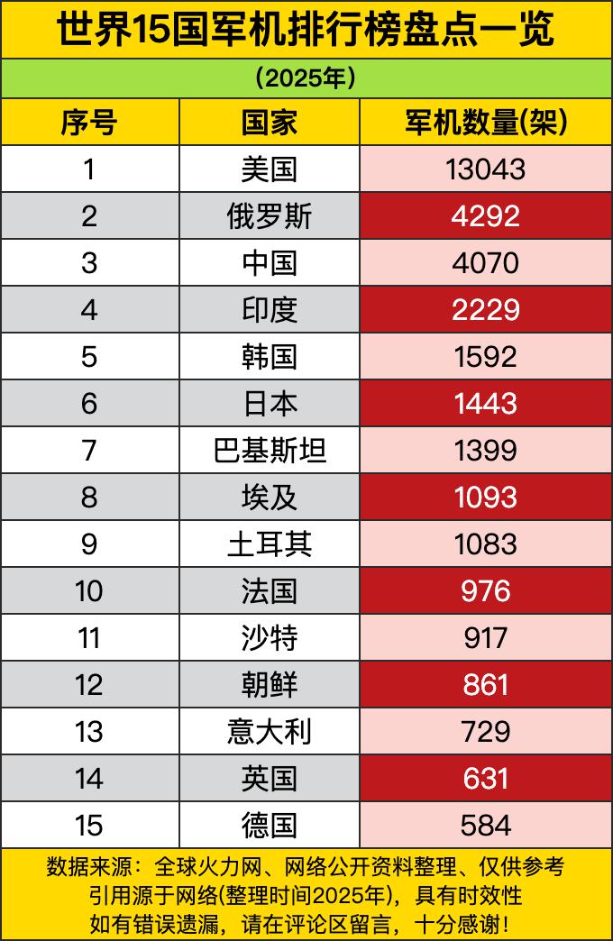 美国以13043架军机一骑绝尘。这数量,简直是开了挂,就像超级大胃王吃自助餐,别人还在拿盘子选吃的,它已经把桌子都快摆满了。这庞大的军机队伍,在全球天空那绝对是相当有存在感,仿佛在大喊:“天空是我家开的!” 再瞧瞧紧跟其后的俄罗斯和中国。俄罗斯有4292架,中国有4070架,这俩紧追不舍,像是两个实力强劲的竞争对手。俄罗斯那是老牌军事强国,就像江湖里的前辈高手,底蕴深厚;中国呢,发展迅猛,如同后起之秀,一路飞奔,不断缩小差距,这两位未来在军机领域估计还得继续“相爱相杀”。 然后看看其他国家,印度以2229架排第四。这印度啊,一直想在军事上有点大作为,买买买停不下来,就盼着能靠数量堆出个厉害劲儿。不过这军机再多,要是维护和运用跟不上,那也只是个“花架子”。就好比一个人买了一堆名牌衣服,可不会搭配,也显不出啥时尚感。 至于剩下的国家,数量就更参差不齐了。像韩国、日本等,军机数量在千架左右徘徊,各有各的小算盘。韩国想提升自己在亚洲的影响力,日本呢,一直妄图突破限制,在军事上有所动作。但这些跟前面几位大佬比起来,还真得加把劲儿,不然在这天空的“武林”里,只能当个小喽啰啦!