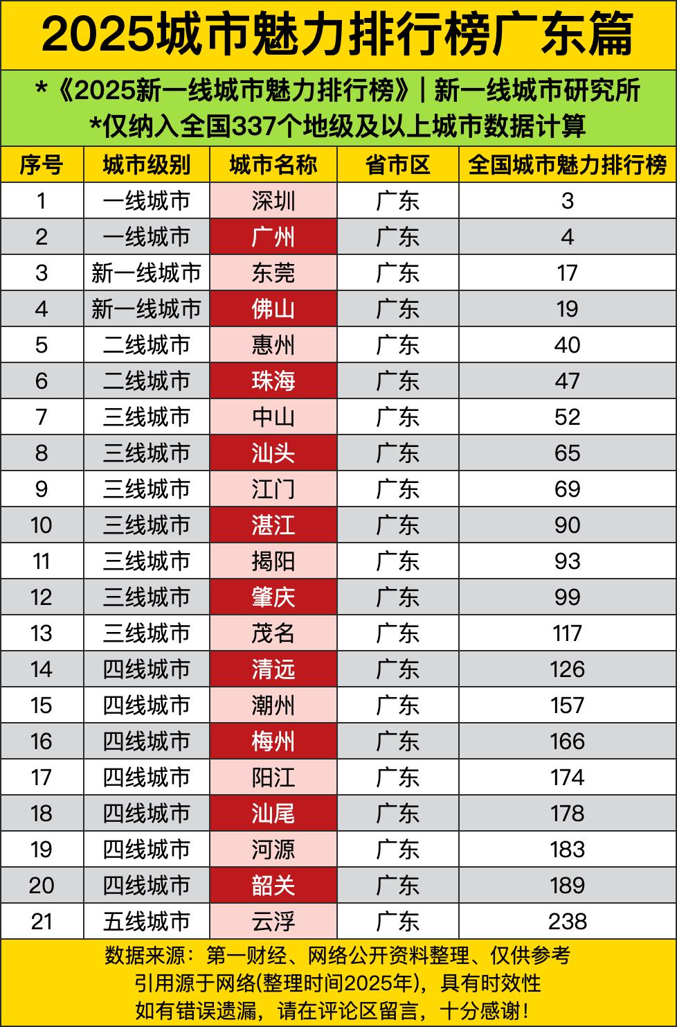 深圳稳坐一线城市第三把交椅,那可是科技与创新的代名词,就像班级里的学霸,每次考试都名列前茅。广州紧随其后,作为老牌一线城市,底蕴深厚,好比班级里的老班长,经验丰富,啥都能hold住。 再瞧瞧新一线城市的东莞和佛山,这俩就像班级里的尖子生,努力又上进。东莞制造业超厉害,啥电子产品都能造出来,就像个心灵手巧的巧匠。佛山呢,不仅有发达的工业,还有深厚的文化底蕴,武术、陶瓷啥都有,简直是全能选手。 接着说说二线到五线的城市。惠州的风景那是杠杠的,就像班级里爱美的同学,总是把自己打扮得漂漂亮亮。而云浮在五线城市里,虽然排名靠后,但也在努力追赶,就像班级里暂时落后的同学,憋着一股劲要往前冲呢。 其实啊,城市排名只是一方面,每个城市都有自己的闪光点。不管是一线大城市的繁华,还是小城市的宁静,都有它独特的魅力。就像咱们每个人一样,都有自己的价值,都在自己的生活里发光发热呢!