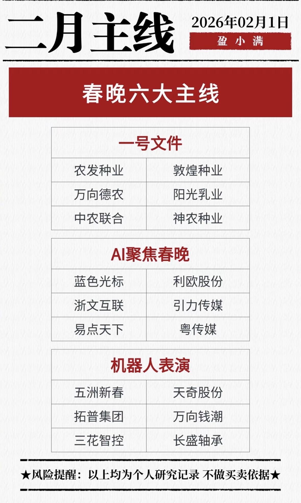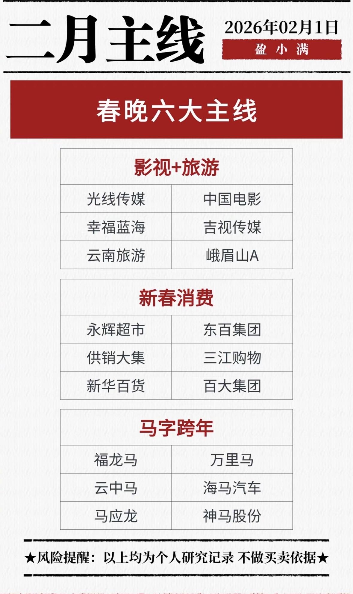 "二月行情聚焦影视旅游与新春消费,关注传媒、零售及马字概念股,投资需谨慎。" "二月投资热点:影视旅游+新春消费主线,关注传媒、商超及马字概念股,注意风险自担。"