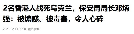 真为“港独”智商堪忧!2026年2月1日报道,两名香港人为学习“暴动技巧”,加入乌军,战死战场! 不知大家是否听过黎智英的名字,他是一位非常严重的“反中乱港”分子。与外部势力勾结,犯下累累罪行。而他最终也付出一定代价,被抓捕归案。这起案件备受国人关注,黎智英并不是第一位港独分子,也不是最后一位。 就在2026年2月1日的时候,据媒体报道,有两名香港人为了学习“暴动技巧”。竟加入了乌克兰军队,最终被俄军打死在了俄乌战场上。 这则消息引起国人的高度关注,据香港特区政府保安局局长回应,这两名男子是在2025年11月份赴往的乌克兰。这则消息令人为之心碎,同时也令人感慨万分。 香港是一个非常和平的地区,而且我国高度重视香港的发展。自回归之后的香港获得了很多的发展机会,更是一度成为我国的名片之一。但偏偏还是有人试图煽动暴乱,去搞破坏。 持有这种思想的人,最终战死在战场。不知是忧大于喜,还是喜大于忧。而这件事情也进一步的证明,暴力的思想已经严重影响了香港年轻人。 这两名年轻人本有着光明璀璨的未来,但却深受这种暴力思想的影响,最终踏上了俄乌战场,战死在异国他乡。 这起事情也再一次给我国敲响了警钟,我国表面看上去岁月安好,但实则并不然。在很多看不到的地方,仍旧存在着腥风血雨。 很多年轻人的三观还未被养成的情况下,就已经被暴力思想严重影响。当下的香港具有这种思想的人,绝对不仅只有这两个年轻人。 对此,您怎么看? (信息来源:2名香港人战死乌克兰,保安局局长邓炳强:被煽惑、被毒害,令人心-南京晨报)