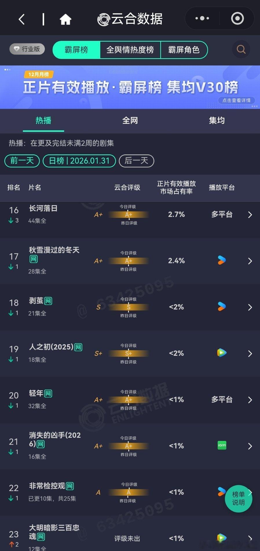 1月31日云合播放占比云合 太平年16.1%评级略有下降,未更新也算正常。生命树云合8.3%生命树 翻倍成功,翻2.37倍,被黑了两天能有这个数据算不错了,这两天非V原来只更新一集,略有些慢。电视剧生命树 罚罪2 7.1%稳稳的有罪之身6.3%横住了,剧情看点挺拉扯的。
