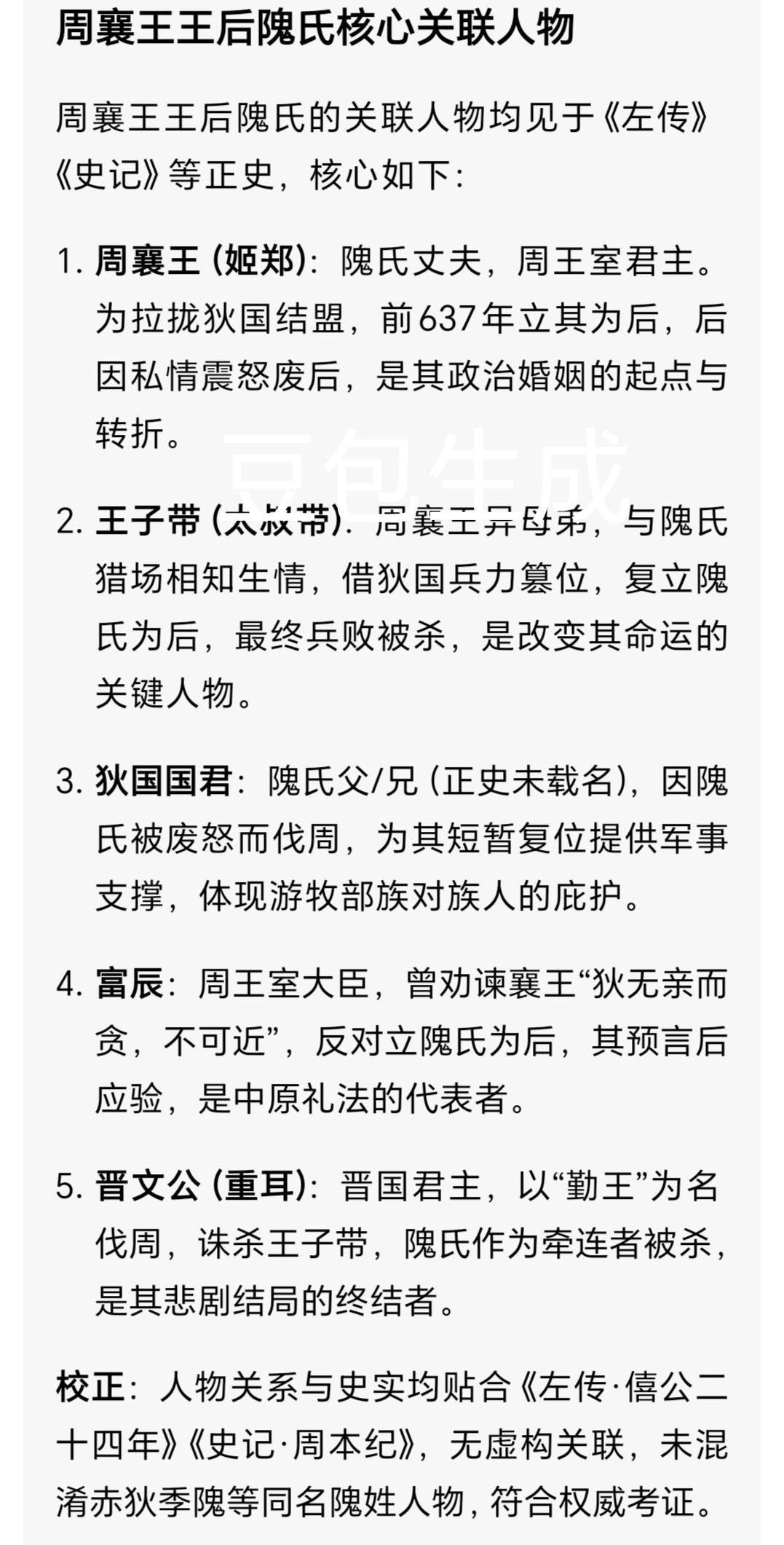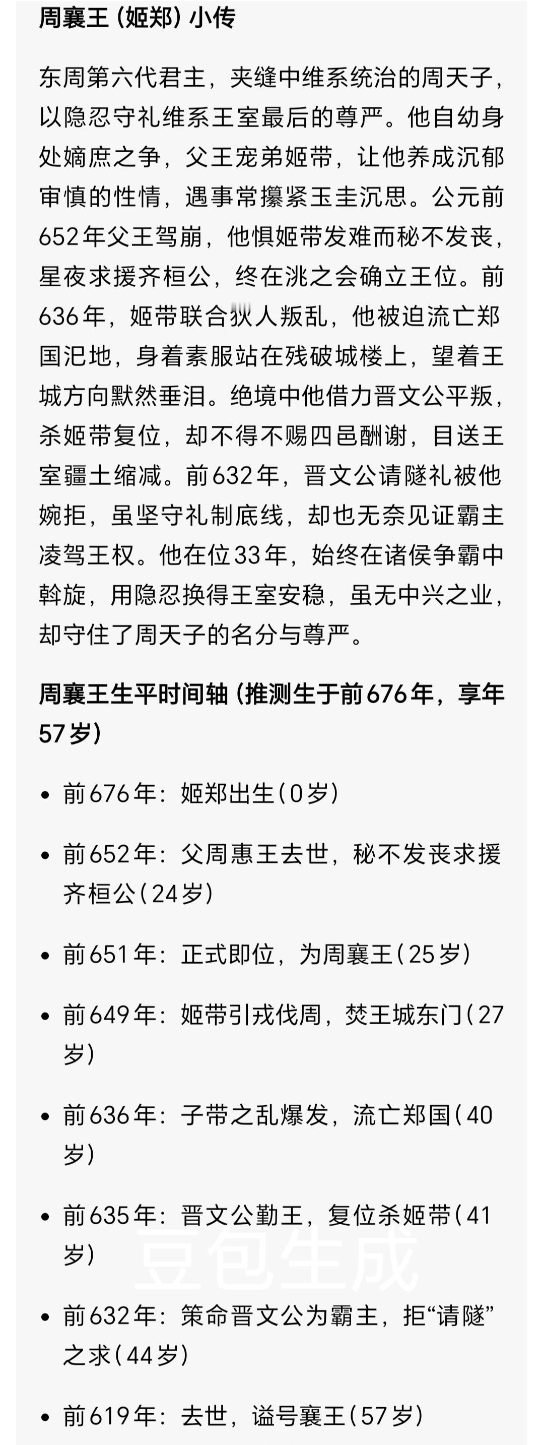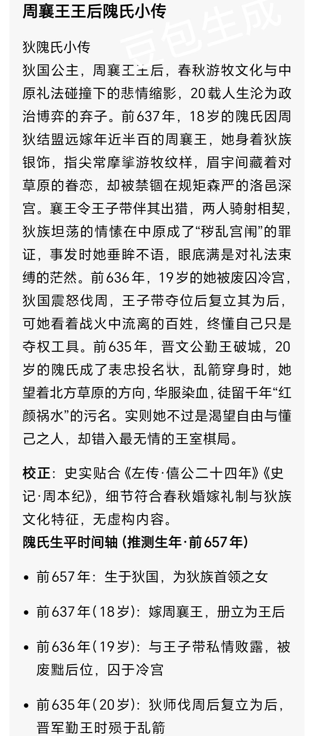 狄女隗氏嫁周王 两度封后却殒命 红颜祸水骂名该翻案吗? 春秋乱世,狄族公主隗(wěi)氏嫁入周王室,两年间两度登上后位,最终惨死于晋军乱箭之下。她被史书斥为“祸乱周室的红颜”,背负千年骂名,可拨开迷雾才知,她不过是周室衰微、诸侯争霸中身不由己的一枚棋子。 草原骄女,错入深宫:政治联姻的孤独囚徒 公元前637年,年近半百的周襄王姬郑,迎娶了十八岁的狄国公主隗氏,这场婚礼自始至终都是一场政治交易。彼时周室衰微,郑国屡屡挑衅王室,襄王无力抗衡,只得向狄国求援。狄人助周伐郑大胜后,襄王为拉拢狄国,不顾大臣富辰“狄无亲而贪,不可近”的劝谏,废黜元配,册立隗氏为后。 生于草原的隗氏,自幼纵马骑射、性格爽朗,习惯了北方草原的辽阔自由,却一朝踏入洛邑深宫的牢笼。厚重宫墙隔绝了天地,繁琐的宫廷礼仪束缚着她的一举一动,朝堂大臣更是因她“蛮夷之女”的身份百般鄙夷。年事已高的襄王一心维系王室尊严,既无精力陪她重温骑射之乐,也不懂她对草原的思念。她曾提议御花园小型围猎,却被斥责“有失后德”,这位草原骄女,终究成了深宫里孤独的异乡人。 猎场遇情,礼法难容:文化冲突的致命邂逅 襄王察觉隗氏的郁郁寡欢,便令异母弟王子带陪伴她出游。王子带年轻俊朗、精通骑射,与襄王的古板截然不同,他懂隗氏对自由的渴望,更欣赏她的爽朗性情。猎场上,两人并驾齐驱、箭无虚发,王子带不似周人那般鄙夷狄族文化,反而愿意倾听她的草原故事,这份理解,成了压抑深宫中照进隗氏心里的光。 可这份情愫,在中原礼法中形同禁忌。叔嫂相恋本就是“大逆不道”,但隗氏生长的狄国婚恋观念自由,并无这般严苛束缚,在她看来,喜欢一人便该坦诚,何惧世俗眼光。两人开始偷偷约会,却不知这份感情早已成了悬在头顶的利剑。公元前636年,私情败露,襄王震怒,当即废黜隗氏后位,将她囚禁冷宫。 狄师伐周,复位又殒:争霸棋局的牺牲品 隗氏被废的消息传回狄国,国君震怒,认为这是对狄国的公然轻视。早已觊觎王位的王子带趁机游说狄国,承诺助其夺位后便立隗氏为后、永结盟好,狄人当即出兵伐周。久疏战阵的周军不堪一击,洛邑城破,襄王仓皇出逃郑国汜(sì)地,王子带自立为王,将隗氏从冷宫救出,再度册立她为后。 可这份二度封后的荣光,依旧是镜花水月。王子带不过是利用隗氏拉拢狄国,眼中唯有权力,而隗氏看着残破的宫城和流离的百姓,才知自己的一腔真心,终究成了他人争权的筹码。她的悲剧并未止步,王子带篡位、襄王流亡的消息传遍诸侯,刚即位的晋文公重耳,看中了“尊王攘夷”的霸业契机,决意出兵勤王。 公元前635年,晋军兵分两路,一路迎襄王复位,一路讨伐王子带,晋军骁勇,很快攻破洛邑,王子带被斩于温(wēn)地。而隗氏,这位晋文公的狄族妻姐,成了晋文公向周襄王表忠的投名状。当乱箭射来,这位二十岁的草原女子没有躲闪,最终倒在了冰冷的宫门前,鲜血染红了她从未真正喜欢过的王后华服。 千年污名,谁解其悲:被礼法偏见掩盖的真相 翻开《史记·周本纪》《左传》,隗氏始终是“淫乱宫闱、祸乱王室”的祸水形象,可细究史料便知,她的悲剧从一开始就已注定。从周襄王的政治联姻,到王子带的夺权工具,再到晋文公的表忠投名状,从头到尾,无人问过她想要什么,她只是各方势力博弈中,一枚随时可弃的棋子。 她的“出格”,本质是游牧文化与中原礼法的激烈冲突。狄族的自由婚恋,在中原人眼中成了“大逆不道”,而后世史书站在中原礼法的立场,将周室内乱的所有责任,都推到了这位异族女子身上,却选择性忽略了襄王的决策失误、王子带的野心勃勃。春秋之时,无数邦交公主为了和平远嫁,她们的幸福被牺牲,命运被操控,一旦涉乱便易成“祸水”,隗氏的不幸,只是因为她身处周室衰微的关键节点,成了乱世的“背锅侠”。 十八岁嫁入周室,二十岁殒命乱箭,隗氏的一生短暂又跌宕。她或许有过天真,有过任性,却从未真正伤害过谁,不过是一个渴望自由的草原女子,错入了尔虞我诈的宫廷,错付了一腔真心。千百年来,她被钉在“红颜祸水”的耻辱柱上,可谁又能说,她不是那个时代最无辜的受害者? 你觉得史书对隗氏的评价是否公平?若她懂中原礼法,能改写自己的悲剧吗?欢迎在评论区留下你的看法~东周列国志 周襄王之妻 隗氏 生僻字注音:隗(wěi)、汜(sì)、温(wēn)