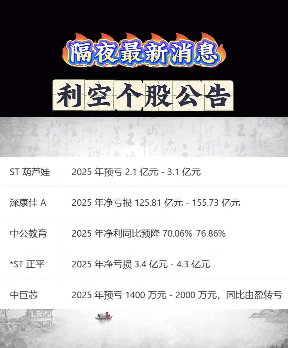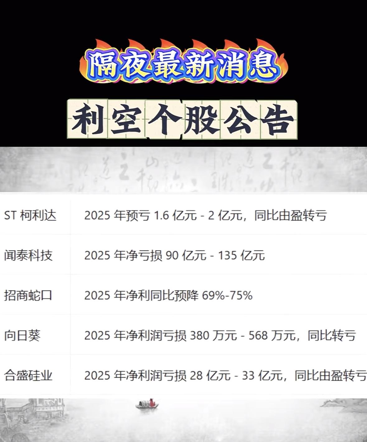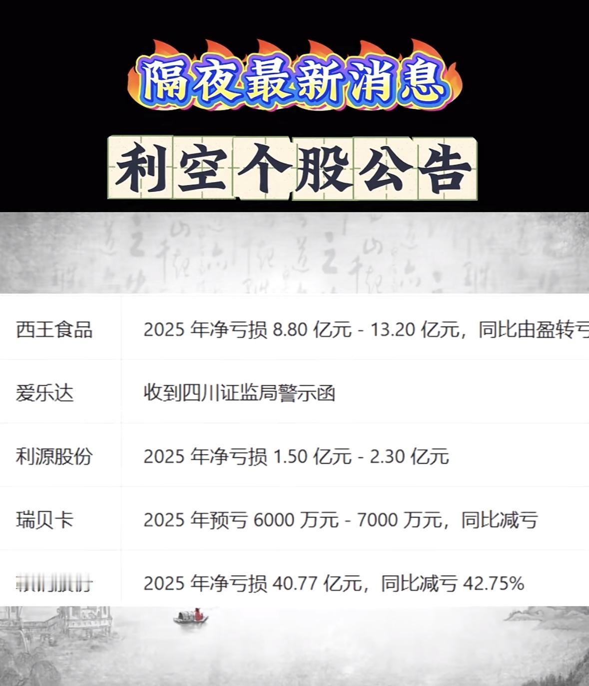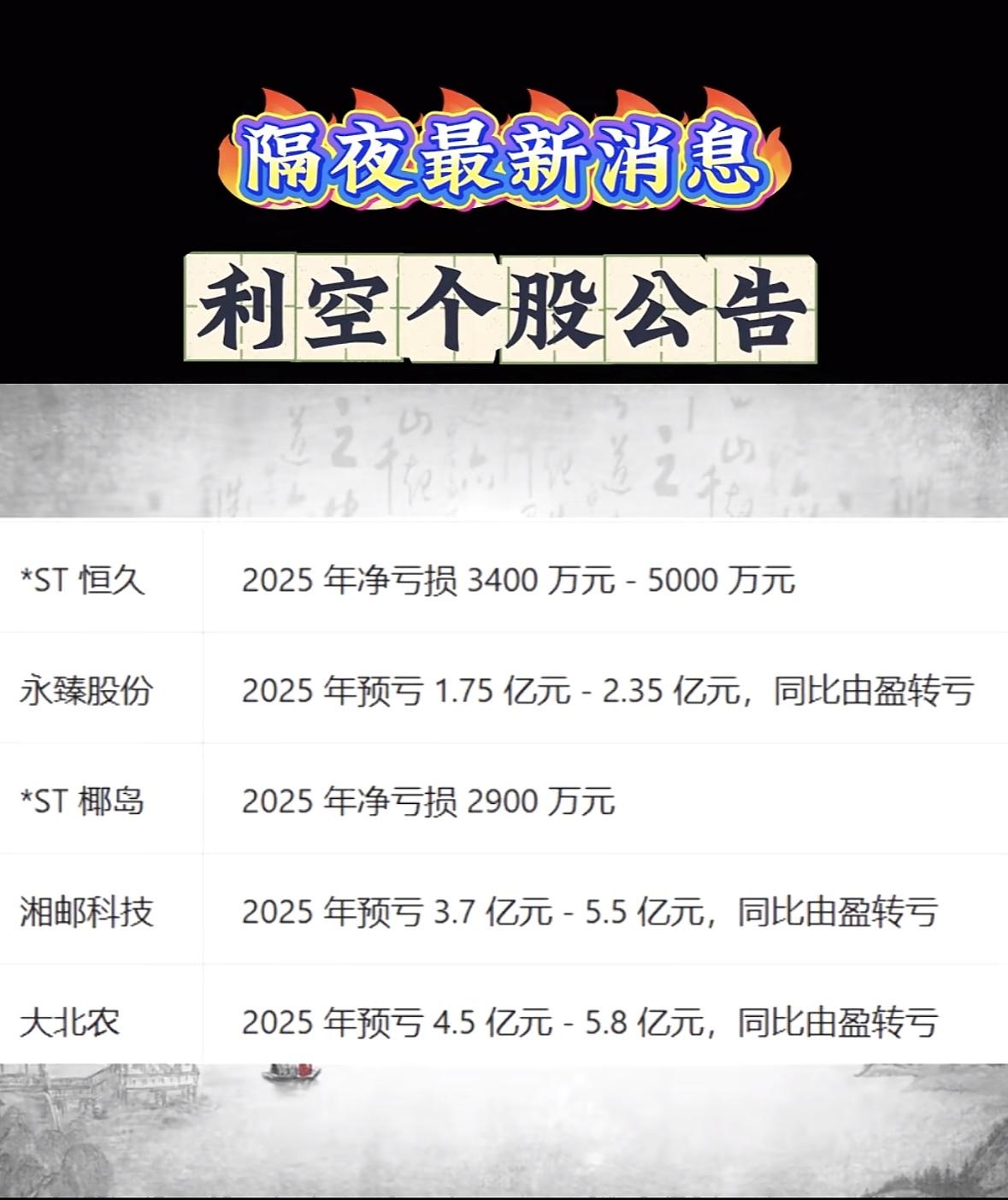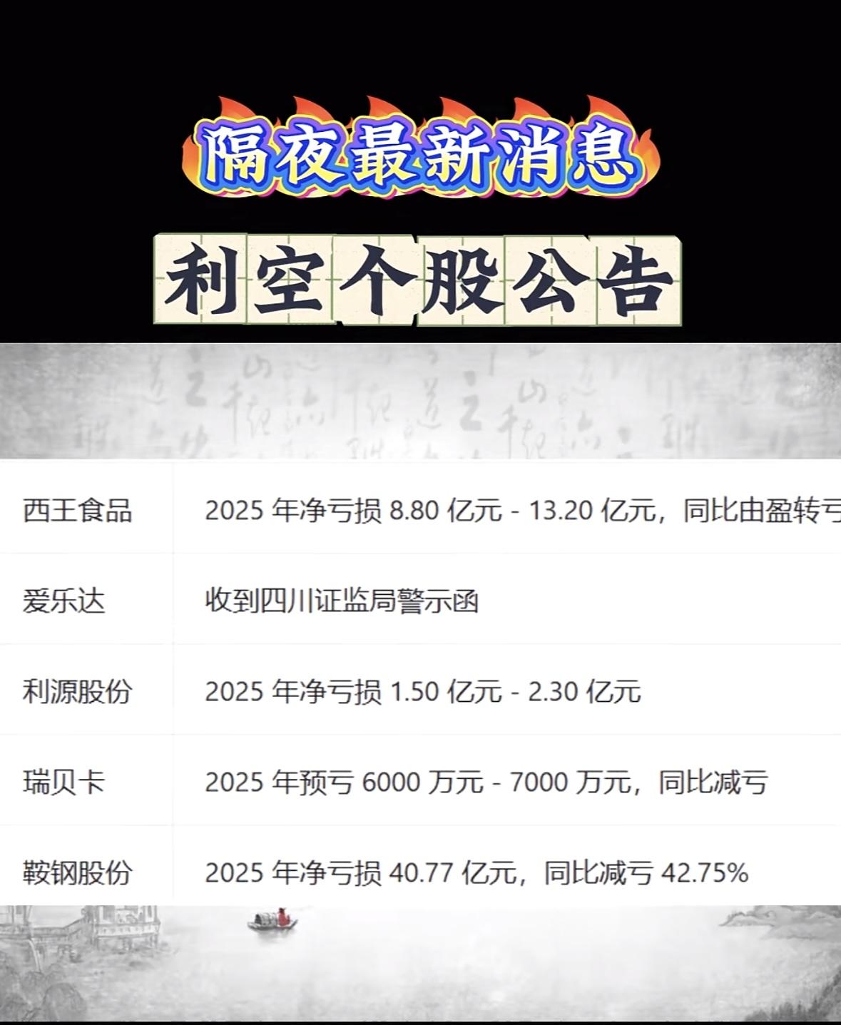 利空个股公告一览,八一钢铁、安阳钢铁等公司受影响 "多家企业年报预亏,*ST恒久、永臻等由盈转亏,市场承压需谨慎。"